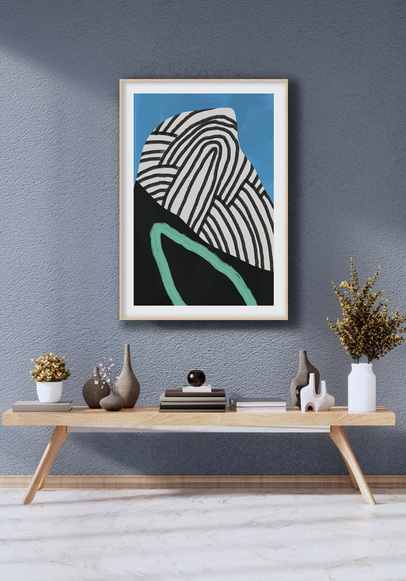 Arte abstracto contemporáneo con forma orgánica rayada en una composición dinámica de blanco, negro y verde azulado sobre fondo azul vibrante. Ideal para interiores modernos o proyectos creativos de decoración.