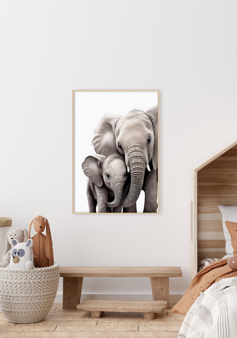 Bella escena de una elefanta con su cría que simboliza cuidado, protección y vínculo familiar, trabajada con gran detalle sobre un fondo luminoso y minimalista que realza su impacto visual.