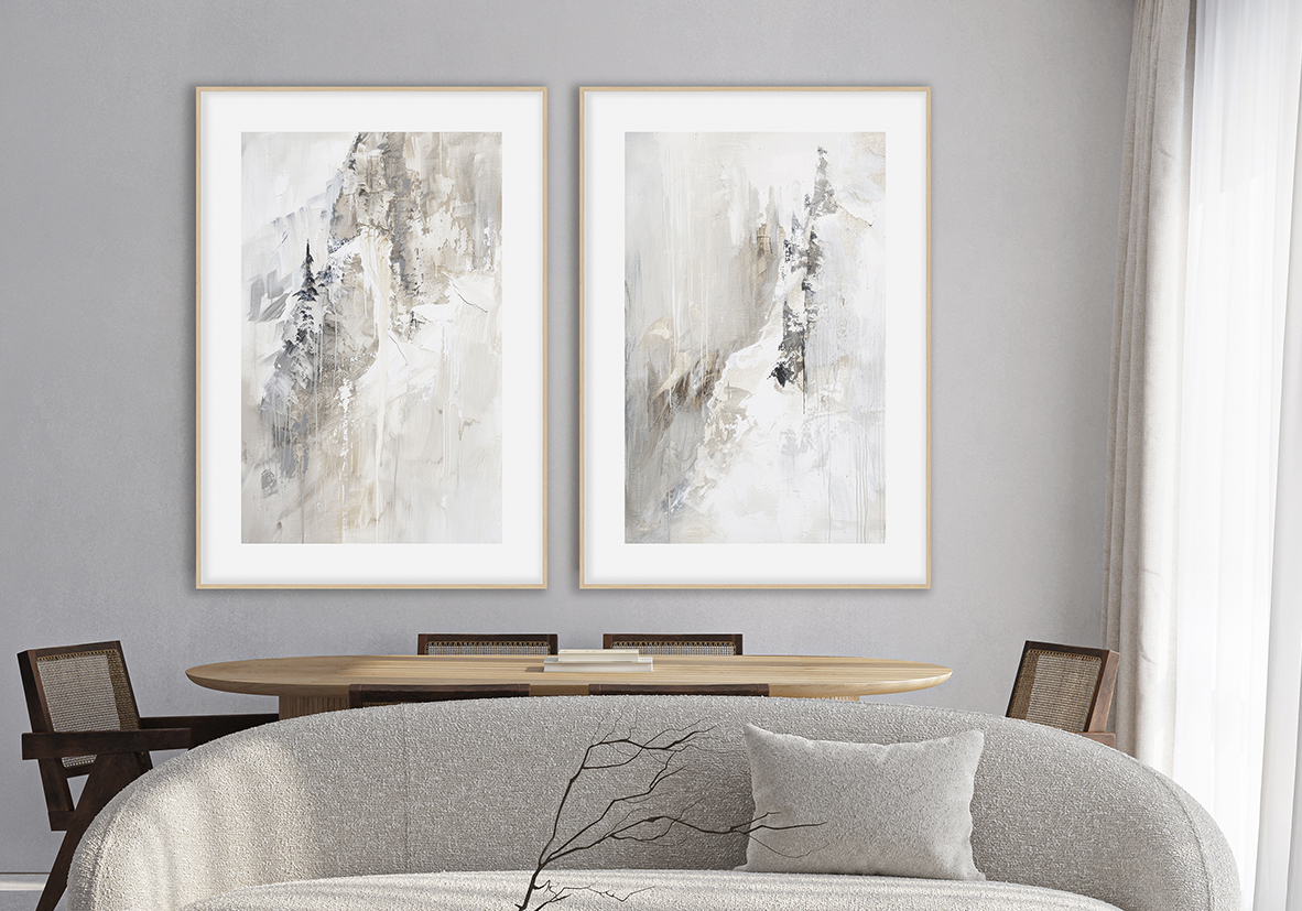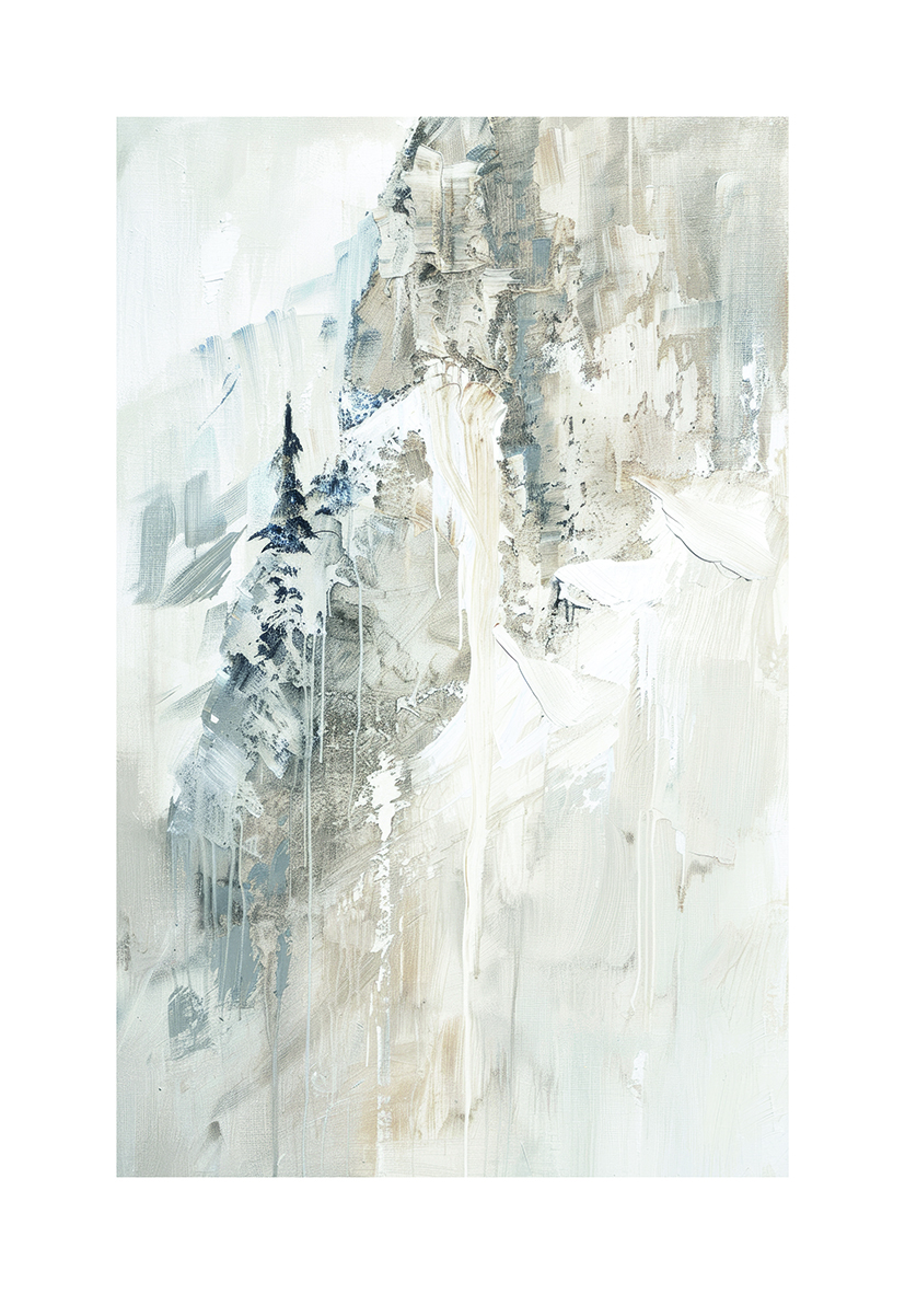 Pintura abstracta en tonos suaves de beige, blanco y gris, que sugiere un paisaje sereno. Aporta un toque sofisticado y natural a la decoración moderna gracias a sus texturas sutiles.