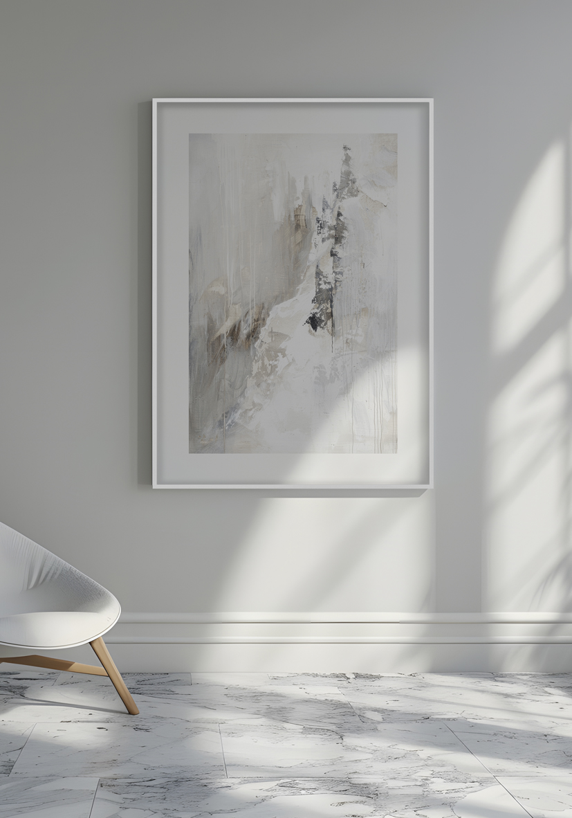 Obra abstracta elegante en tonos gris, beige y blanco, con pinceladas expresivas y texturas fluidas. Aporta encanto minimalista a interiores contemporáneos.