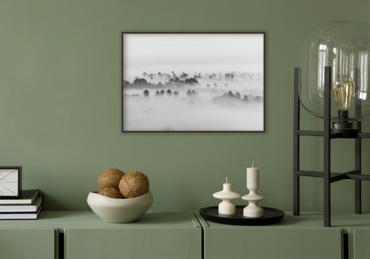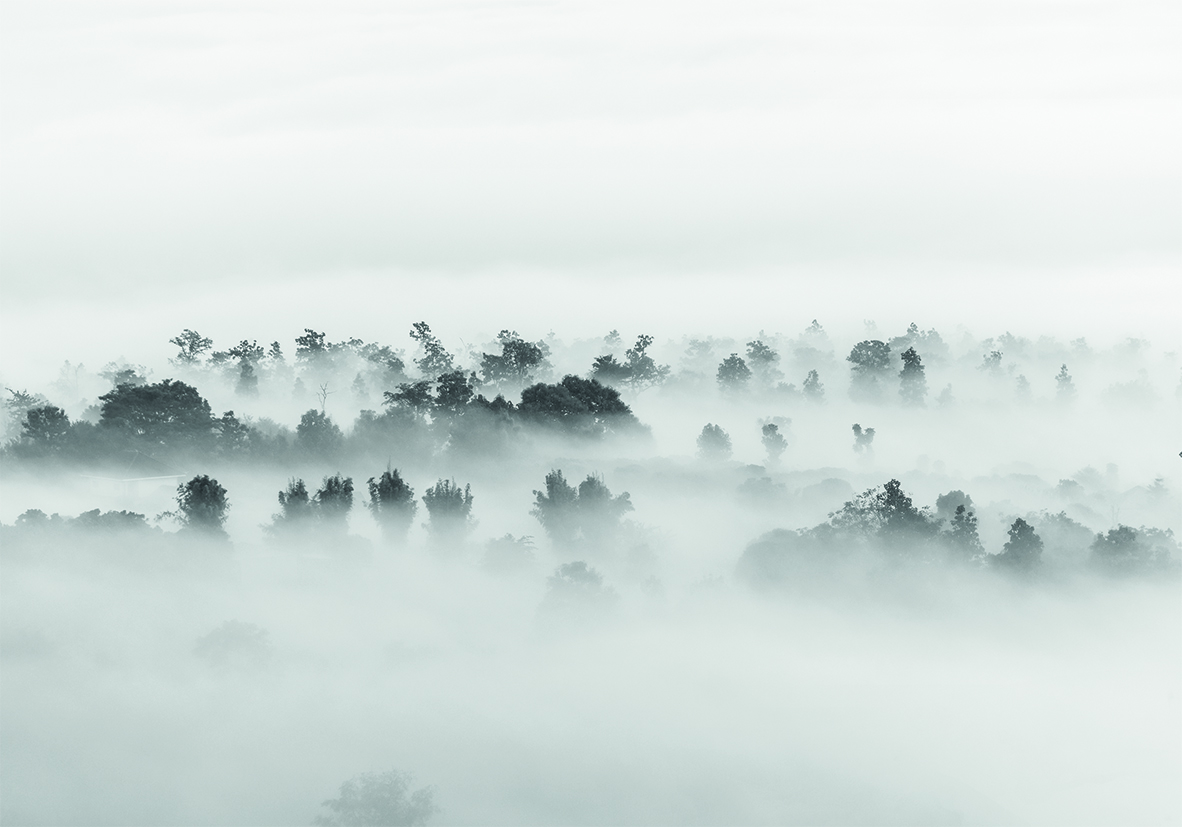 Vista serena de un bosque envuelto en una manta de niebla matutina, enfatizando tonos en escala de grises y evocando una atmósfera pacífica y contemplativa, ideal para inspiración en diseño y decoración tranquila.