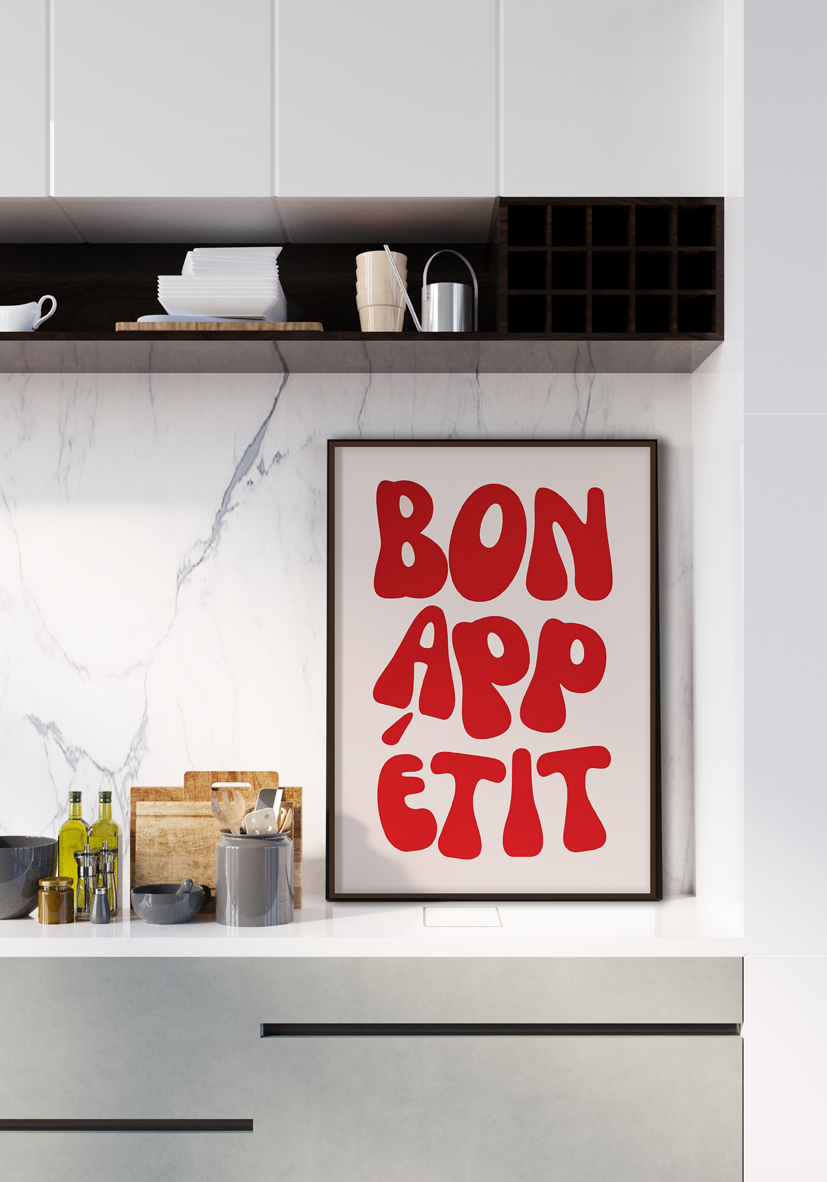 Arte tipográfico retro con letras grandes y burbujeantes en rojo que forman la frase “Bon Appétit”, sobre fondo rosa suave. Ideal para cocinas o cafeterías con decoración vintage.