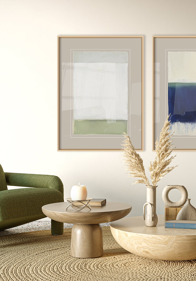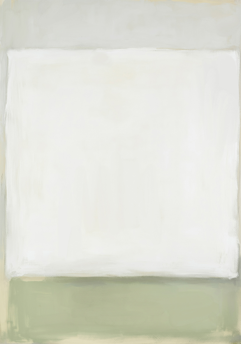 Pintura abstracta minimalista en suaves tonos crema y verde. Transmite tranquilidad y elegancia, ideal para decoradores, arquitectos y amantes del diseño con estética serena.