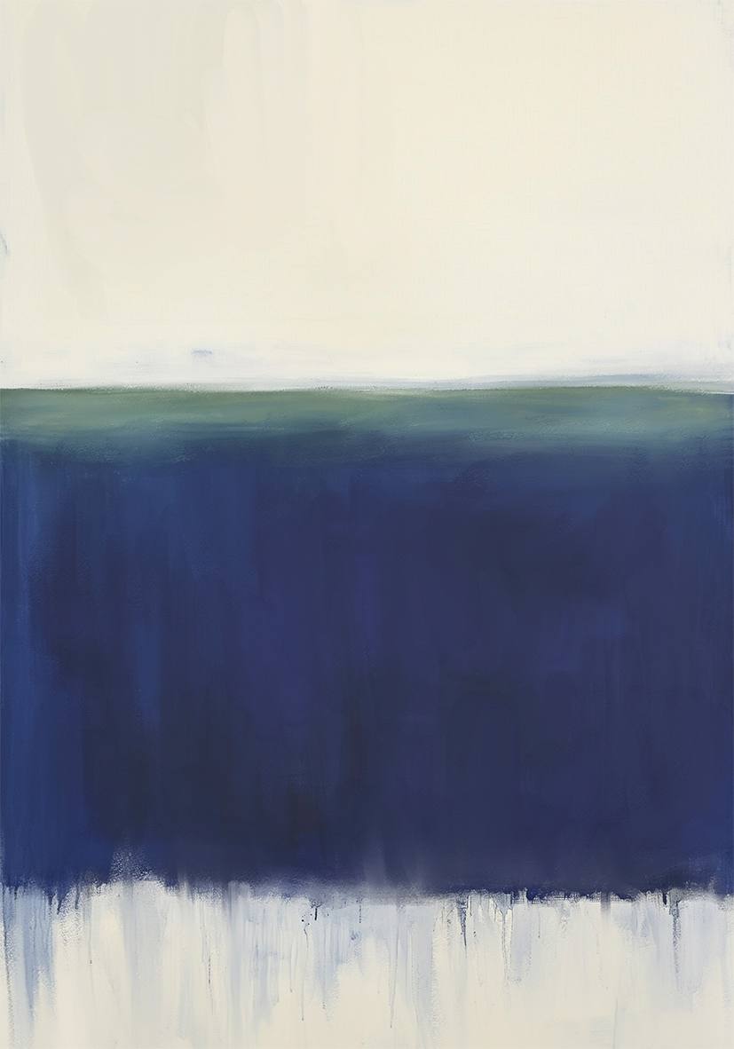 Pintura abstracta contemporánea con un campo inferior azul intenso que se funde con una zona blanca superior. Su diseño minimalista y contraste de color generan profundidad y calma.