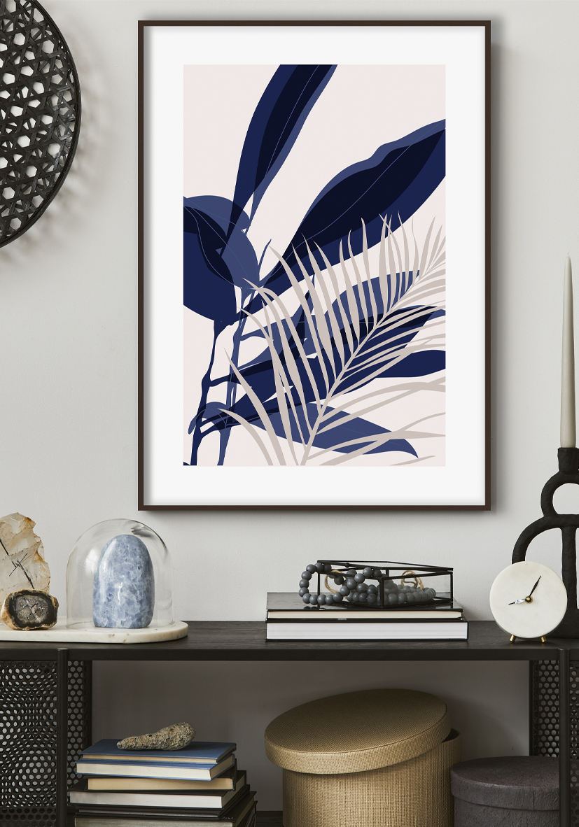 Arte minimalista con hojas en tonos azules y colores neutros en composición abstracta. Ideal para diseño de interiores, aporta estética moderna con una sofisticada fusión de elegancia y estilo natural.