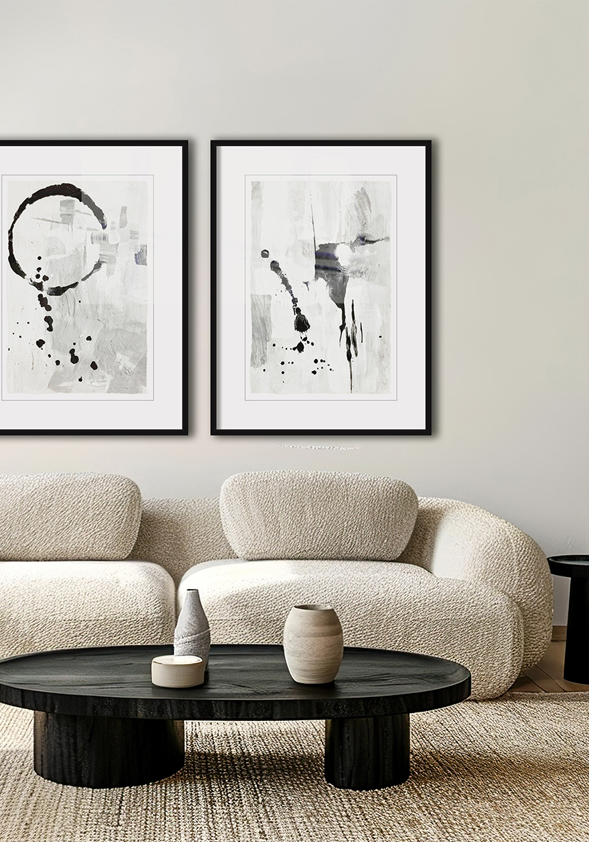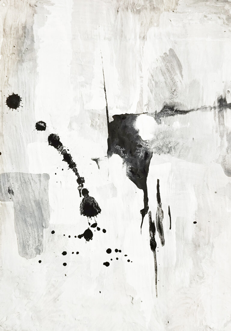 Obra abstracta con capas de textura, manchas y trazos negros que aportan profundidad y carácter. Una propuesta visual potente pero equilibrada, ideal para interiores modernos, estudios creativos o espacios de diseño actual.
