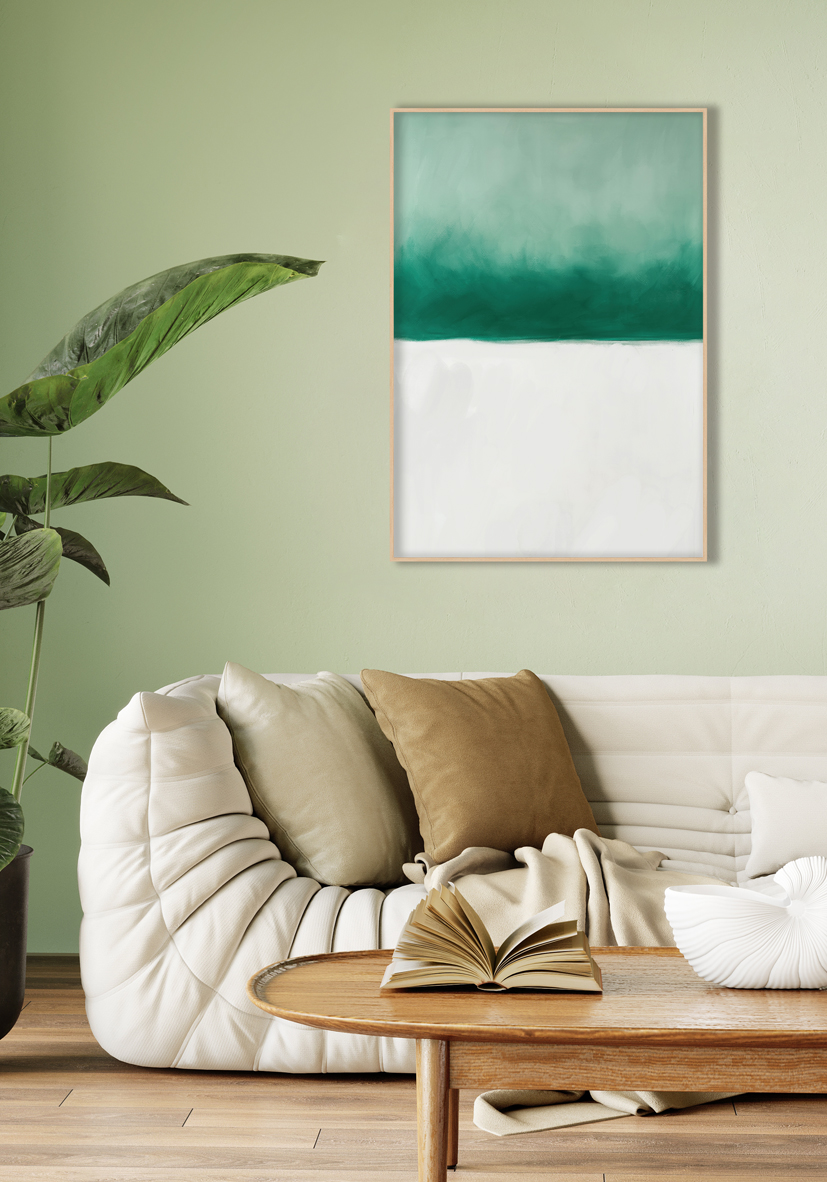 Composición abstracta con degradado suave en verde y blanco, ideal para aportar una estética moderna y calmante a interiores. Perfecta para decoradores y diseñadores que enfocan en espacios contemporáneos.