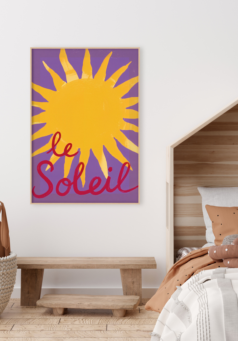Ilustración colorida con un sol amarillo brillante y rayos radiantes sobre fondo púrpura, acompañada por la frase francesa «le Soleil». Ideal para expresar arte y decorar con personalidad.