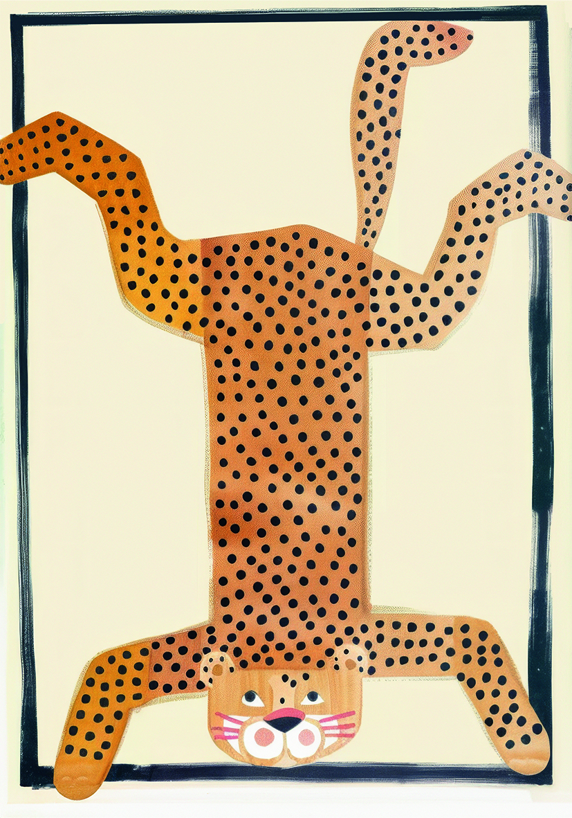 Ilustración artística de un leopardo en pose única, con tonos cálidos naranjas y manchas negras, que evoca creatividad y singularidad. Perfecto para espacios que buscan inspiración y estilo.
