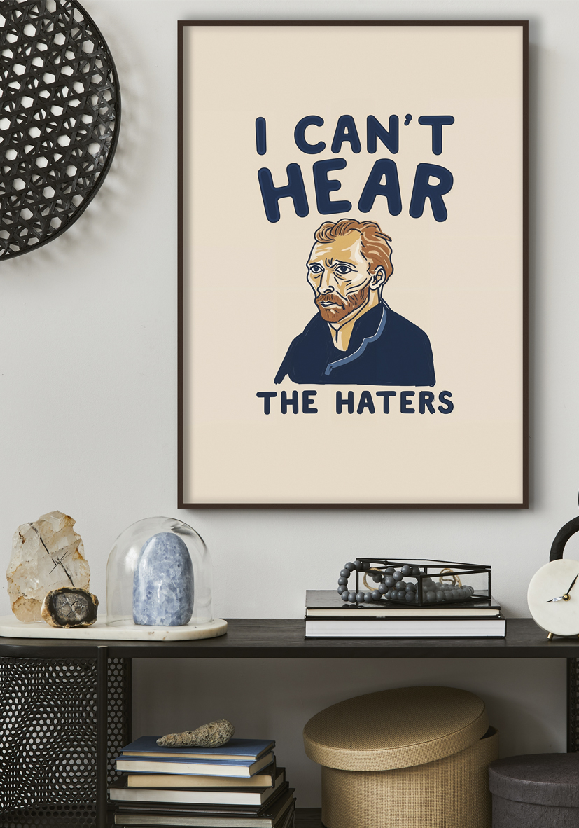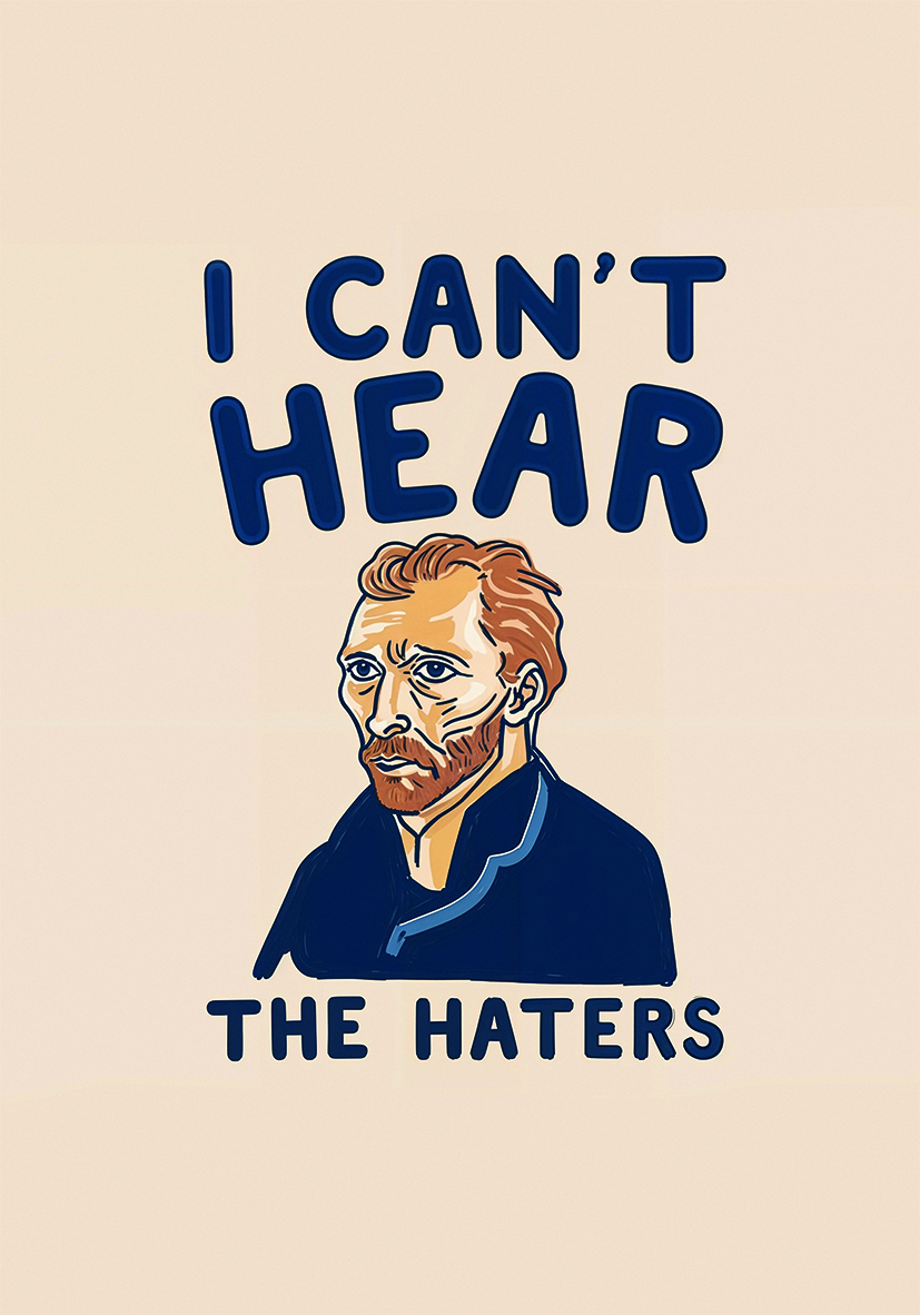Ilustración reinterpretando un retrato famoso con una frase divertida sobre un fondo pastel minimalista. Un guiño visual que aporta carácter y humor. Ideal para salones contemporáneos, despachos o zonas comunes con decoración desenfadada.