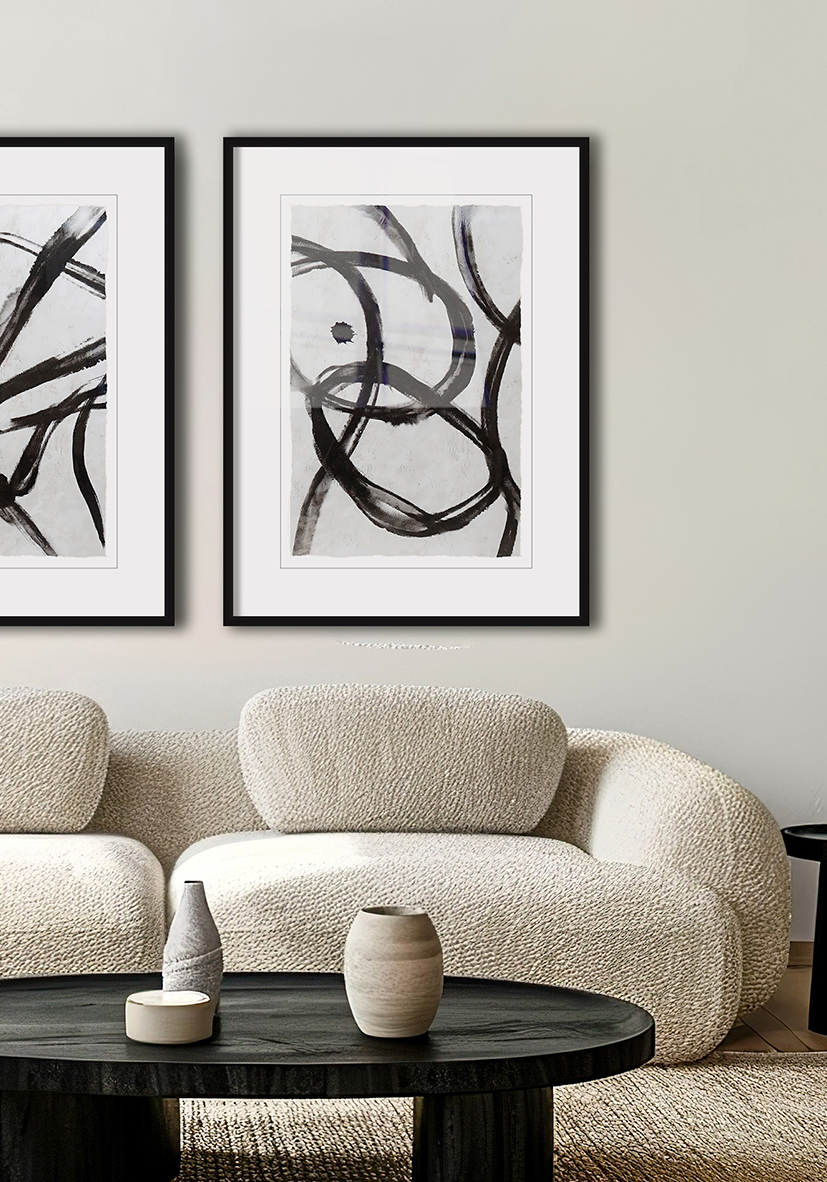 Arte abstracto dinámico con fuertes pinceladas negras sobre fondo blanco. Aporta un punto focal expresivo y contemporáneo perfecto para diversos entornos decorativos modernos.