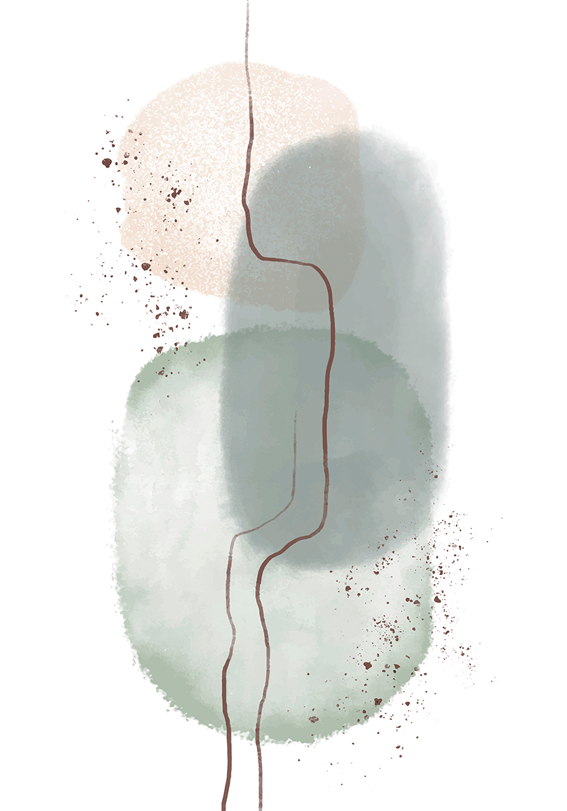 Arte abstracto minimalista con formas suaves en acuarela de tonos beige y verde, acentuadas con líneas fluidas y detalles moteados. Ideal para decoraciones modernas y amantes de la composición artística.