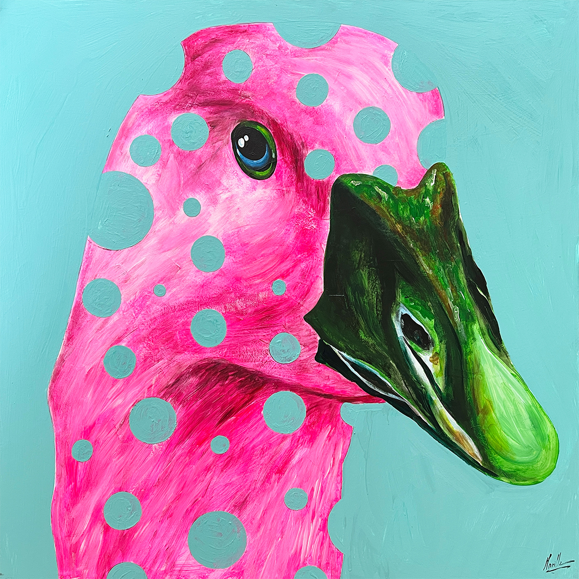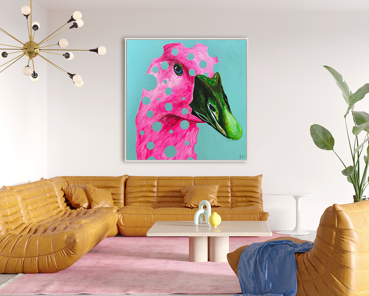 Descubre ‘Duck’, una obra de arte pop que irradia diversión y audacia. Esta pieza impactante presenta la cabeza de un pato en un rosa intenso salpicado de lunares azul aguamarina, contrastando con un pico verde esmeralda y un fondo turquesa brillante. La aplicación de color vibrante y el diseño gráfico audaz la convierten en un punto focal ineludible. Ideal para decoradores, diseñadores de interiores y tiendas de muebles que buscan añadir un toque de color, personalidad y un espíritu juguetón a sus proyectos, perfecto para espacios modernos y llenos de carácter.