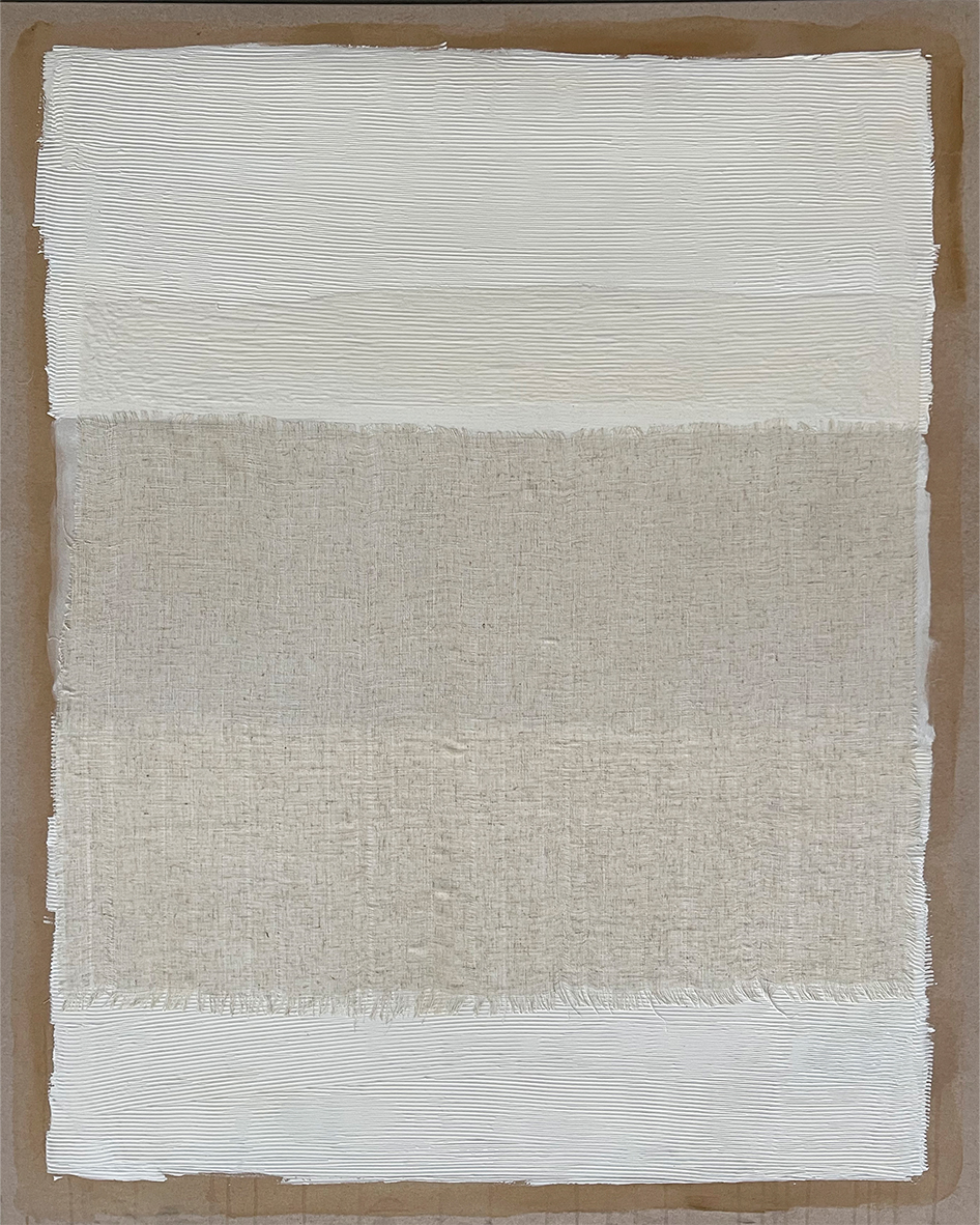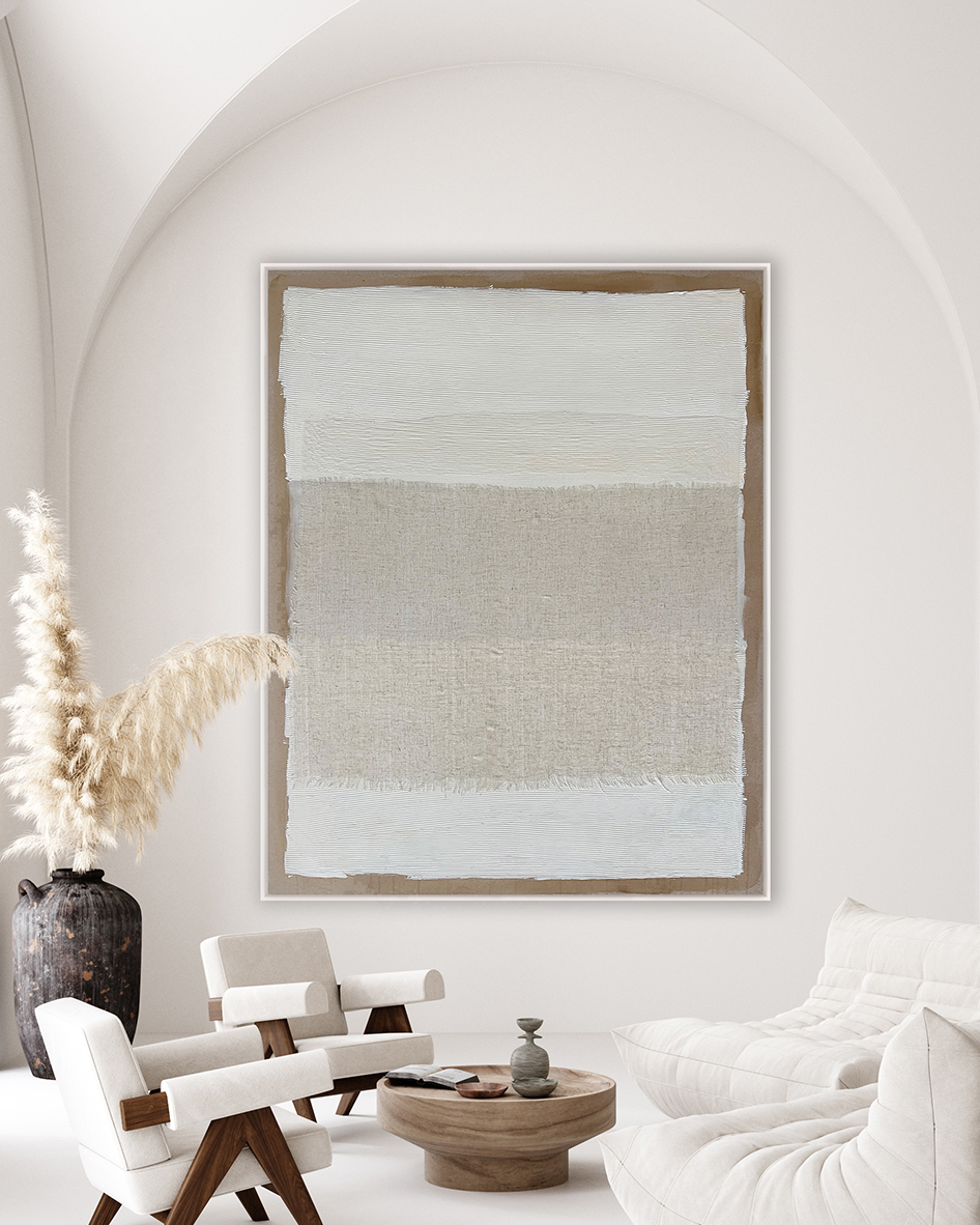 Obra abstracta de inspiración textil que combina tonos neutros y acabados naturales. Su composición sobria y material transmite calma y sofisticación, siendo una opción ideal para interiores minimalistas, hoteles boutique y espacios de estética contemporánea.