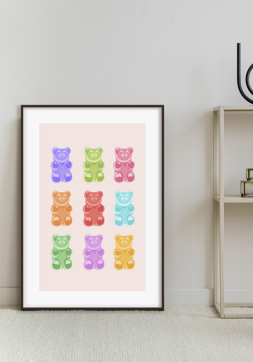 Ilustración brillante de caramelos tipo osito de goma en colores vivos dispuestos en cuadrícula simétrica sobre fondo pastel claro; elemento dulce, divertido y caprichoso para decorar.