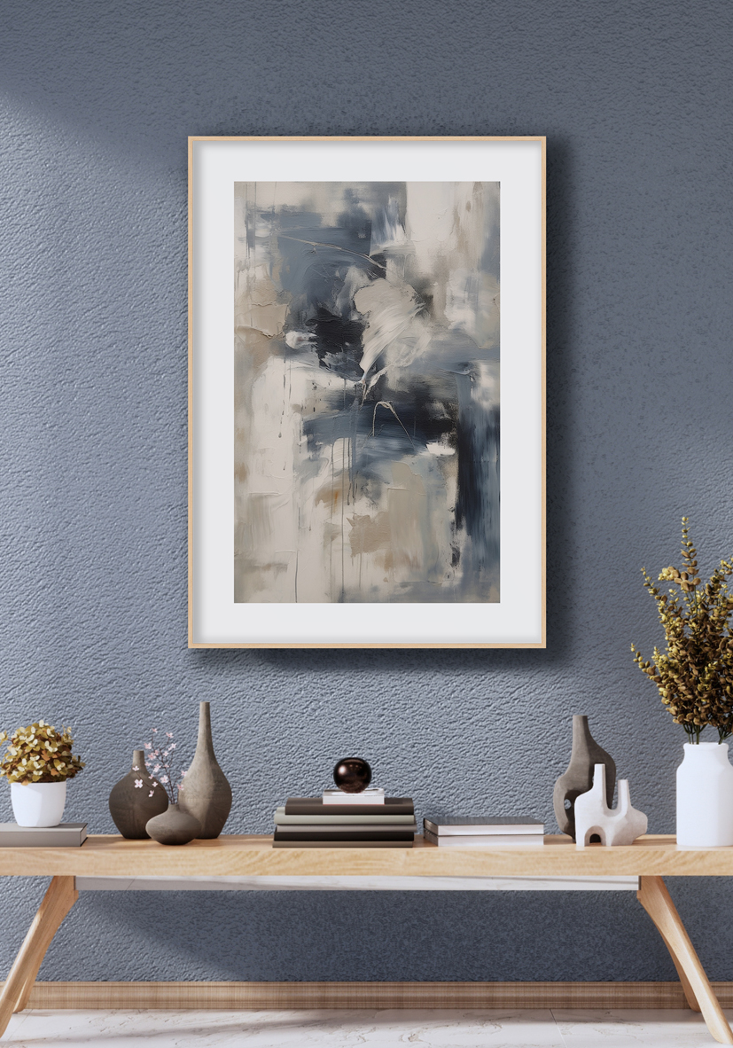 Pintura abstracta con mezcla de tonos azul, beige y blanco, pinceladas fluidas y texturas suaves. Ideal para aportar elegancia contemporánea a cualquier espacio.