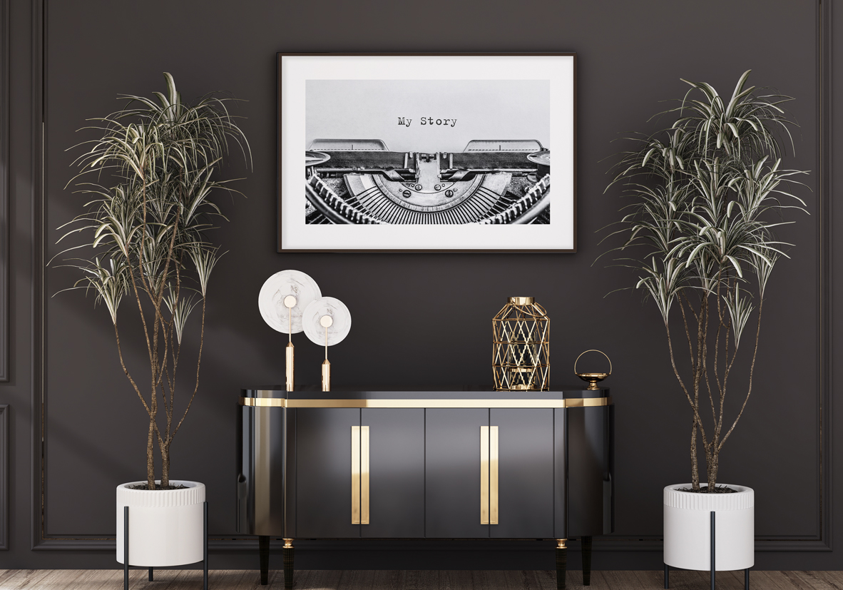 Máquina de escribir vintage que destaca la frase «My Story» sobre papel, simbolizando creatividad, escritura de memorias y expresión personal. Los tonos en escala de grises y la atmósfera nostálgica realzan su atractivo atemporal.