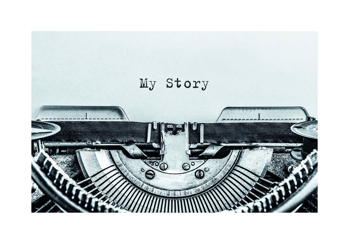 Máquina de escribir vintage que destaca la frase «My Story» sobre papel, simbolizando creatividad, escritura de memorias y expresión personal. Los tonos en escala de grises y la atmósfera nostálgica realzan su atractivo atemporal.