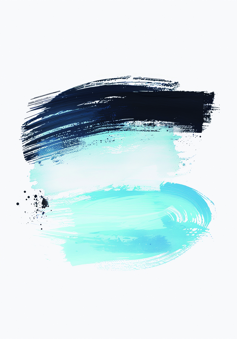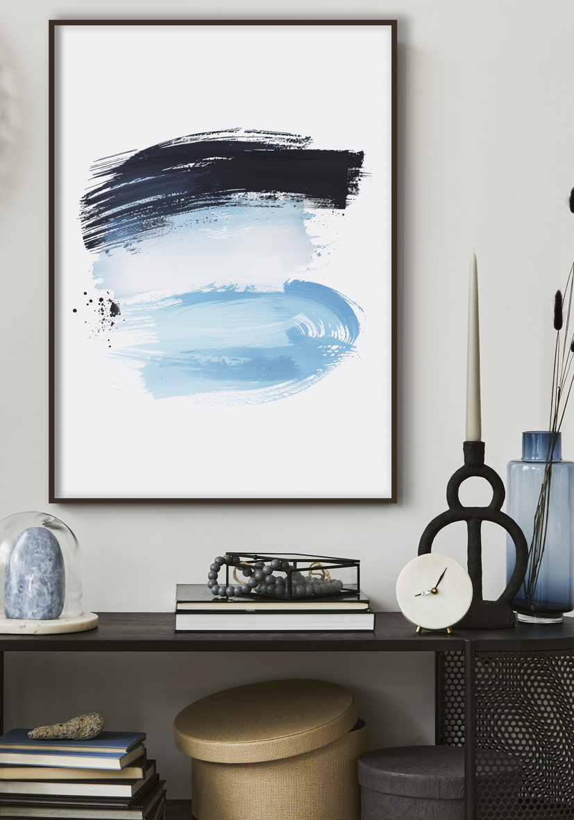 Obra abstracta con trazos azules y negros sobre fondo blanco. Transmite serenidad y contraste, perfecta para proyectos creativos.