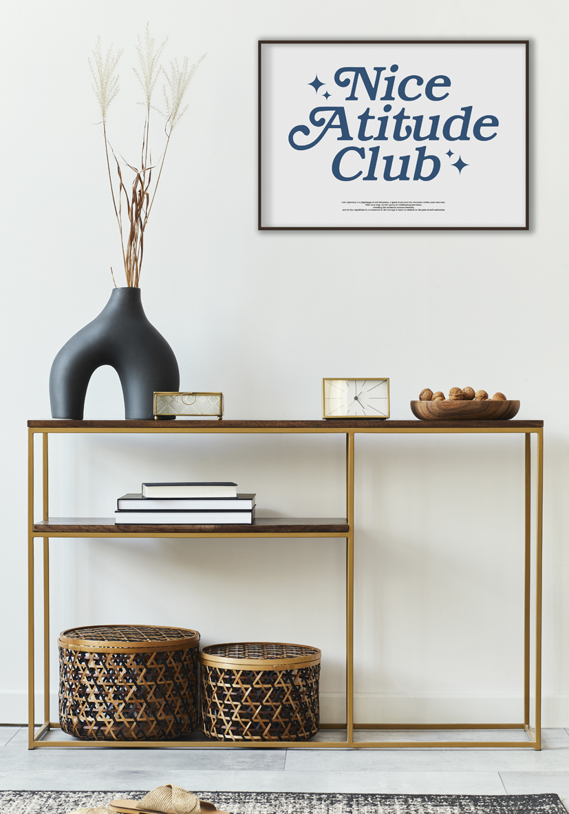 Póster tipográfico con palabras motivadoras rodeadas de pequeños elementos en azul sobre fondo blanco. Ideal para decoración moderna y espacios inspiradores.