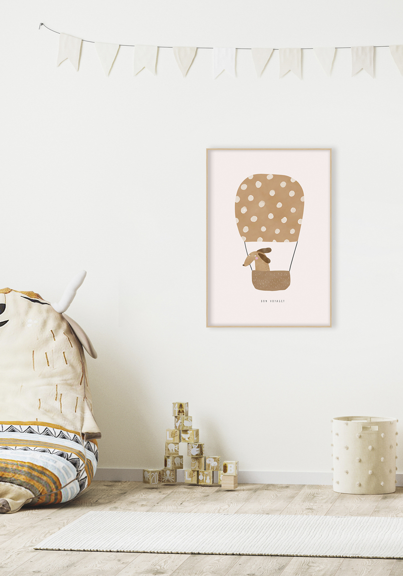Ilustración caprichosa de un perrito en la cesta de un globo aerostático de lunares. Ideal para decoración de guardería o proyectos con temática soñadora y divertida.