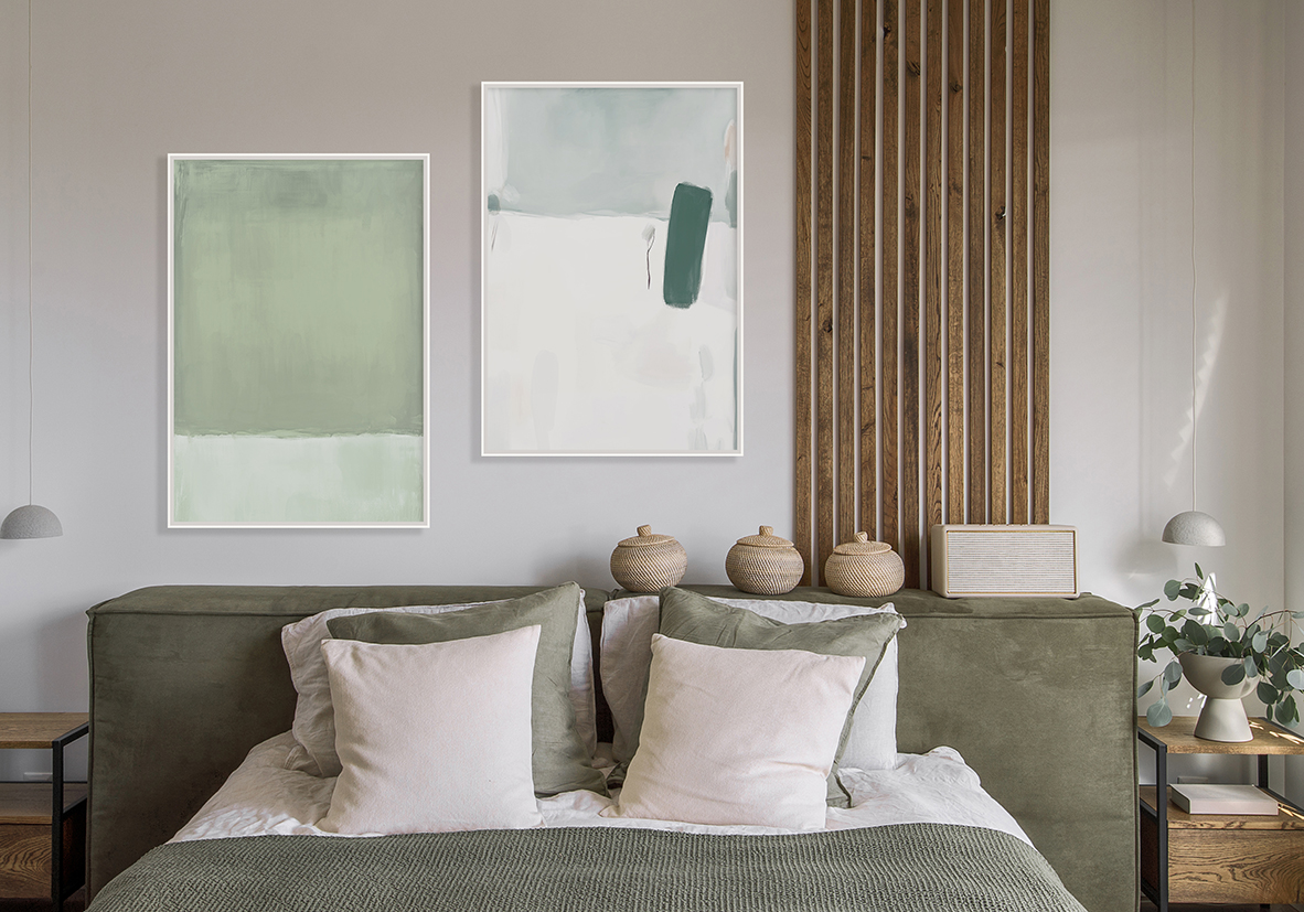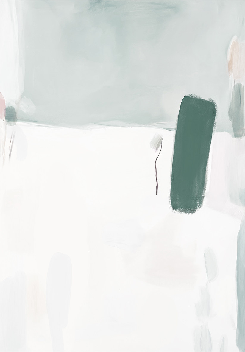 Composición abstracta con una fusión de tonos pastel suaves y un acento verde intenso sobre un fondo sereno. Perfecta para proyectos de diseño interior que buscan un equilibrio entre calma, color y sofisticación artística.