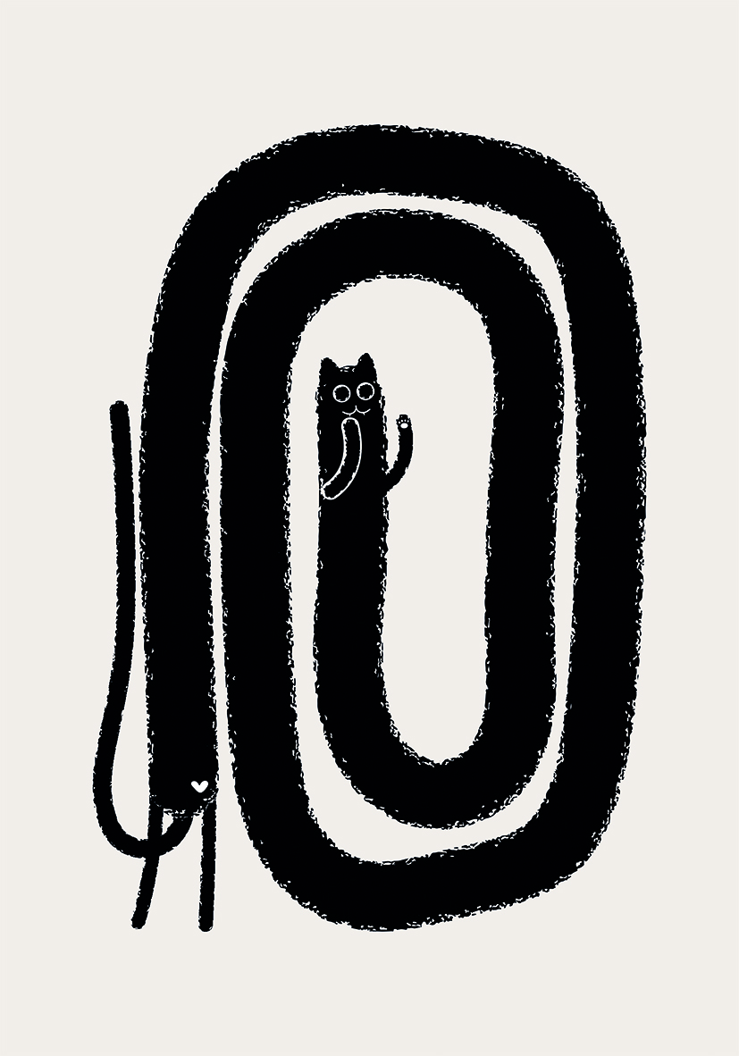Ilustración monocromática artística de un gato, con un diseño creativo y minimalista en tonos negros y formas lúdicas. Ideal para colecciones artísticas modernas o decoración del hogar.