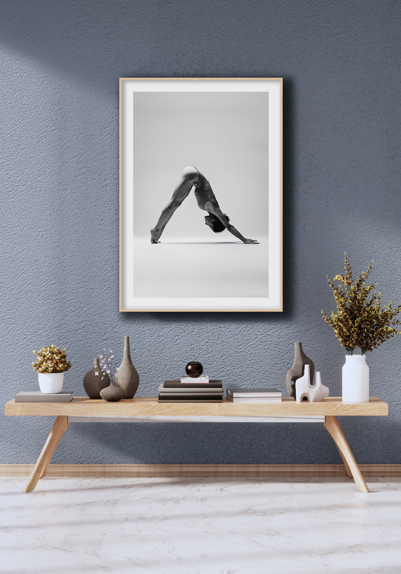 Fotografía monocroma de una persona haciendo una postura de yoga con fondo neutro, transmitiendo equilibrio, concentración y elegancia. Ideal para ambientes relajados y armoniosos.