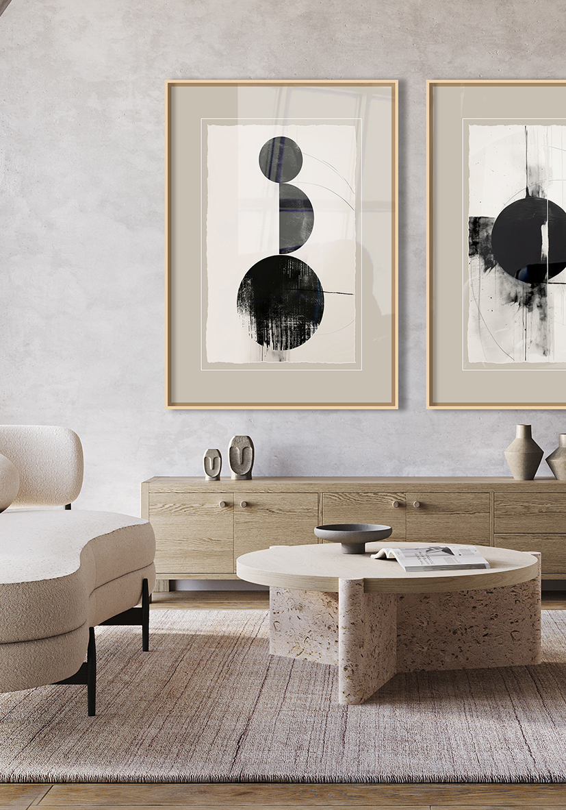Diseño abstracto minimalista basado en la superposición de formas circulares negras sobre fondo neutro. Una pieza sobria y sofisticada que encaja a la perfección en interiores contemporáneos y ambientes de estilo moderno.