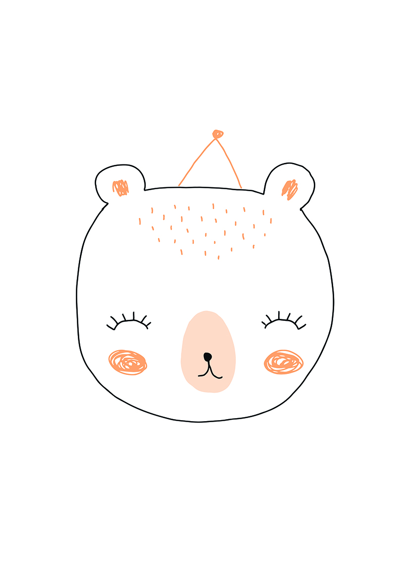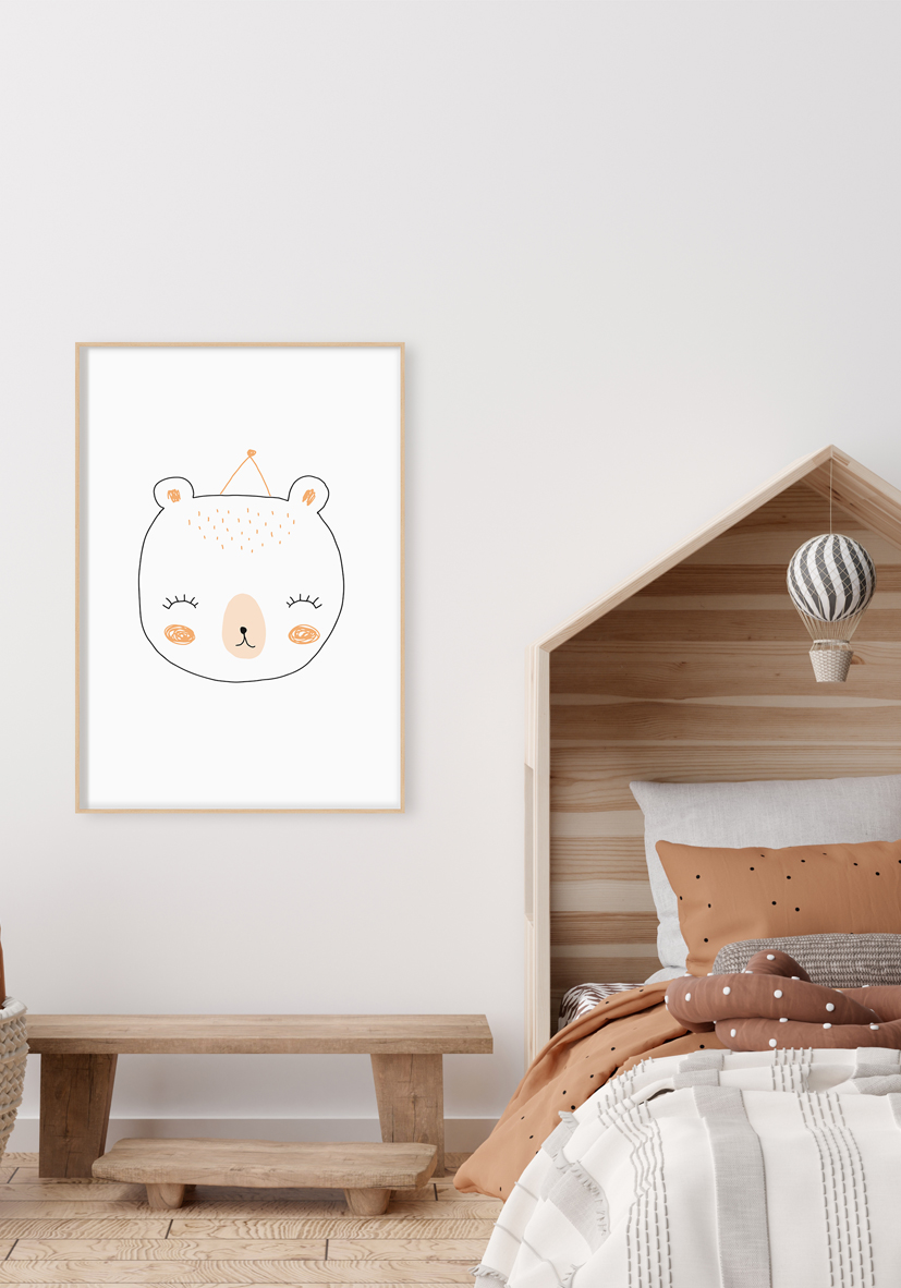 Ilustración simpática del rostro de un oso en estilo minimalista con colores pastel y tonos cálidos. Ideal para decoración de guardería o productos infantiles adorables.