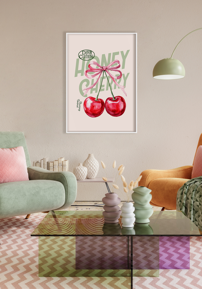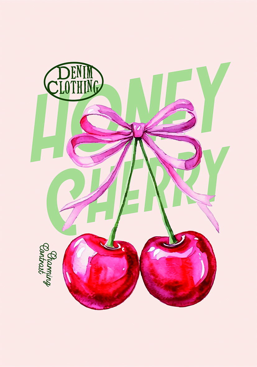 Ilustración artística de dos cerezas rojas atadas con cinta rosa pastel, sobre tipografía verde decorativa. Perfecta para inspiración visual y diseño creativo.