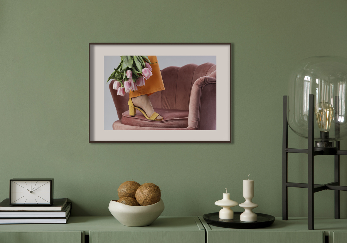 Tulipanes rosados sostenidos sobre una silla rosa con zapatos amarillos y pantalones naranjas. Una escena moderna, elegante y primaveral ideal para decoración de temporada.