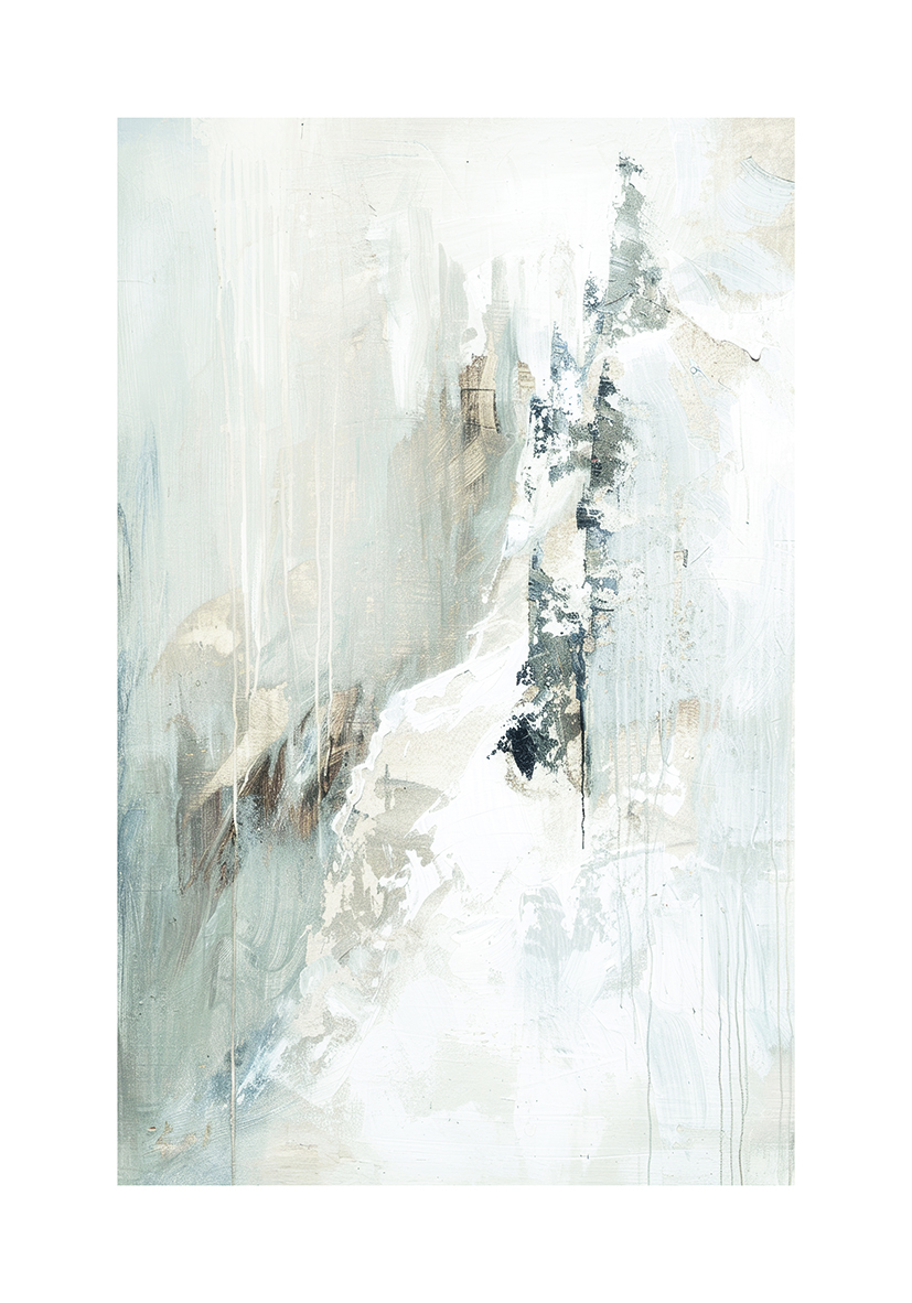 Obra abstracta elegante en tonos gris, beige y blanco, con pinceladas expresivas y texturas fluidas. Aporta encanto minimalista a interiores contemporáneos.