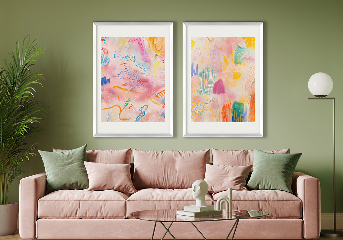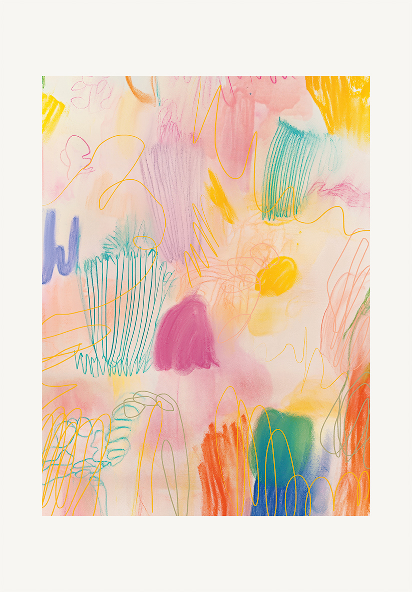 Composición animada con pinceladas abstractas en tonos pastel y líneas expresivas sobre un fondo claro. Evoca creatividad y frescura, perfecta para interiores contemporáneos que buscan un toque artístico y desenfadado.