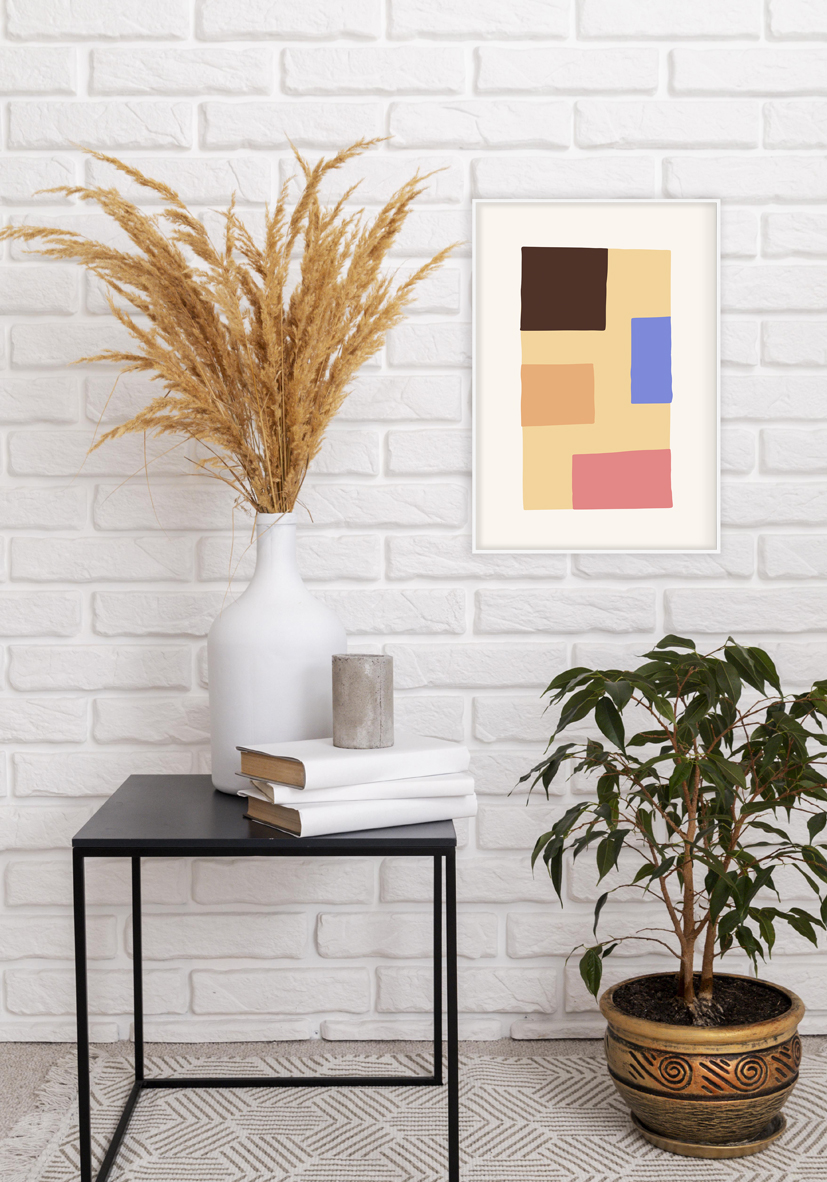 Composición abstracta artística con bloques de color en marrón, naranja, azul y rosa sobre fondo beige, ideal para decoración moderna de interiores y aplicaciones de diseño.