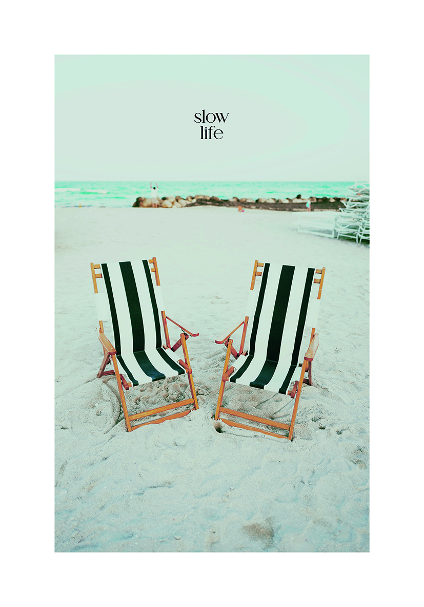 Escena de playa tranquila con dos tumbonas de rayas sobre la arena, con el mar y un espigón rocoso al fondo. Refleja un estilo de vida relajado y apacible.