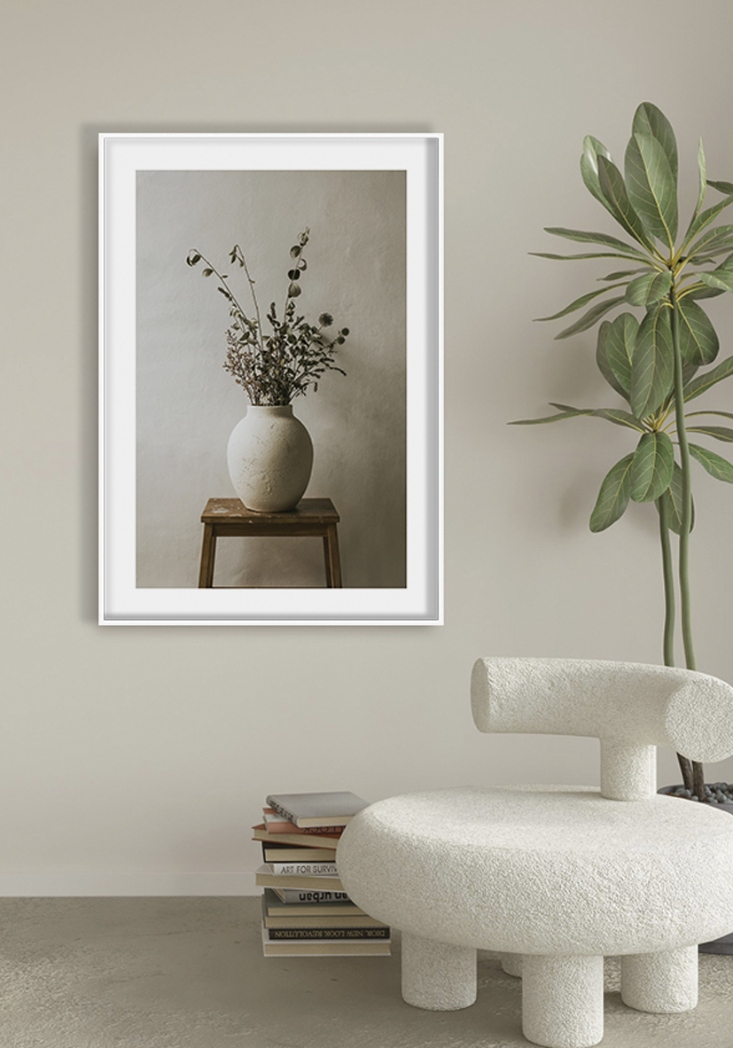 Representación minimalista de un jarrón rústico de cerámica con flores silvestres secas sobre un taburete de madera, en fondo neutro. Resalta la elegancia natural y estética vintage, perfecta para inspiración interiorista.