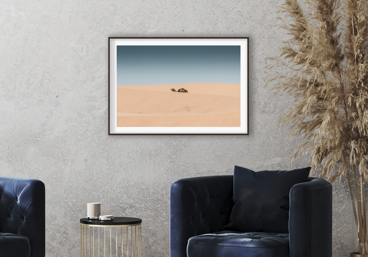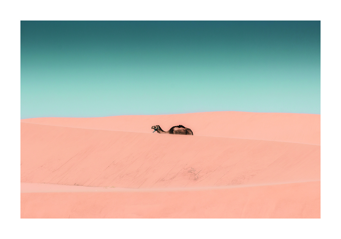 Escena serena del desierto con un camello solitario caminando sobre suaves dunas bajo un cielo azul claro. Transmite una atmósfera exótica y tranquila, perfecta para decoración o inspiración cultural.
