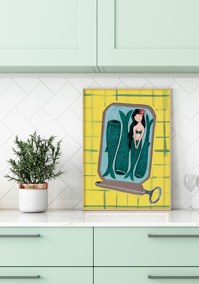 Obra surrealista que representa una sirena serena dentro de una lata. La ilustración mezcla tonos amarillos y azules con un enfoque fantástico y cotidiano. Perfecta para espacios creativos como estudios de arte, rincones de lectura o dormitorios con estilo ecléctico.