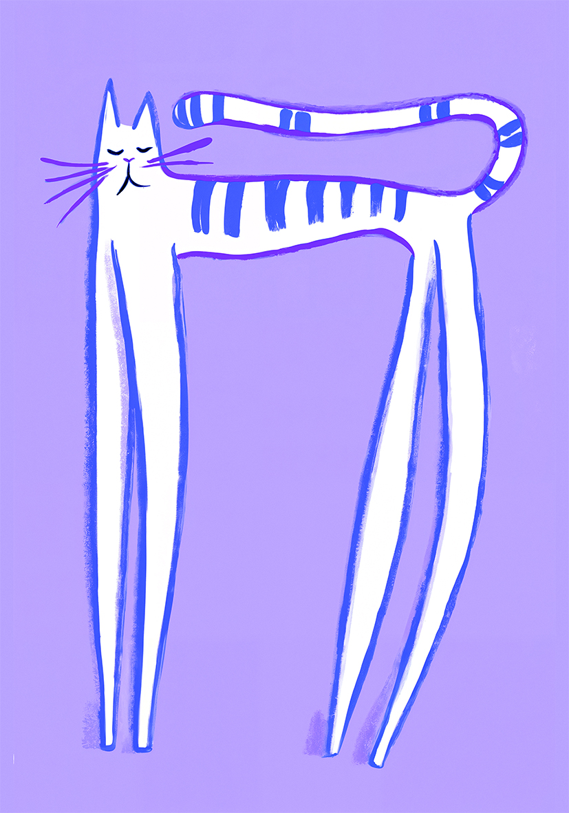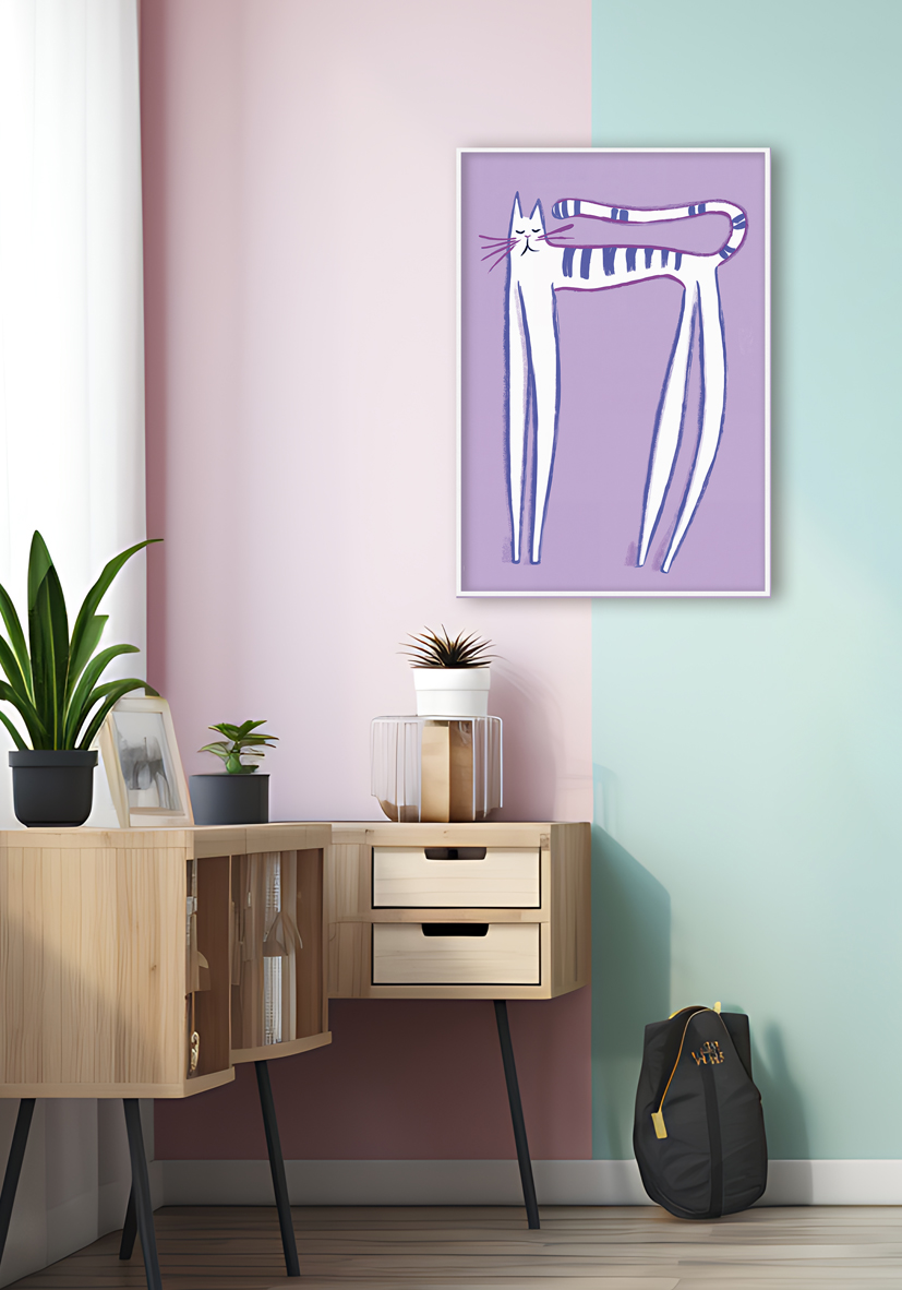 Gato alto y delgado ilustrado con rayas moradas sobre un fondo lavanda. Su estilo caprichoso y expresivo lo convierte en una opción perfecta para dormitorios infantiles, pasillos creativos o zonas de lectura.