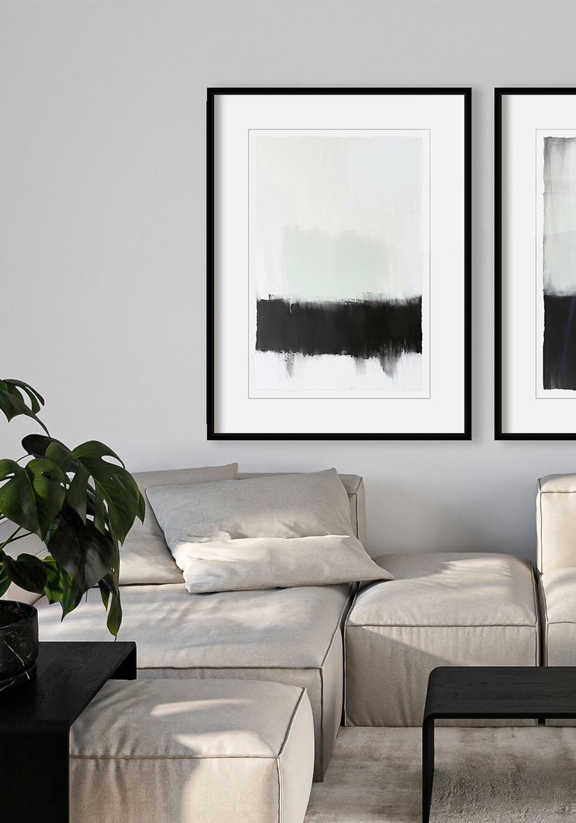 Cuadro abstracto contemporáneo en tonos blanco, negro y gris claro. Diseño minimalista ideal para realzar la estética de interiores modernos.