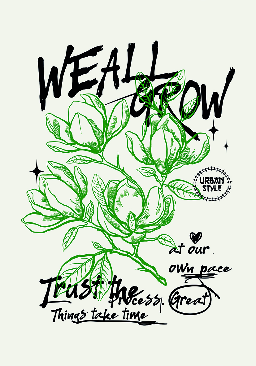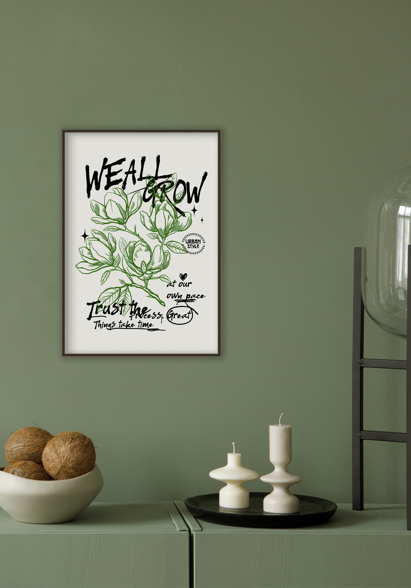 Ilustración de flores dibujadas a mano con frases motivadoras sobre fondo neutro. Perfecta para decoración interior o proyectos de estilo de vida.