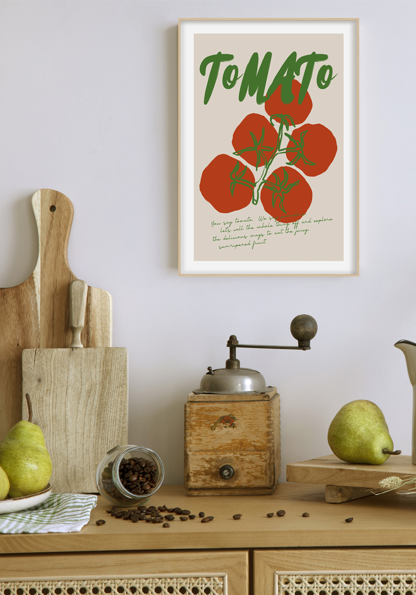 Representación artística de tomates rojos sobre fondo beige con tipografía en verde. Evoca frescura, naturalidad y temática culinaria, ideal como inspiración gráfica o para proyectos gastronómicos.