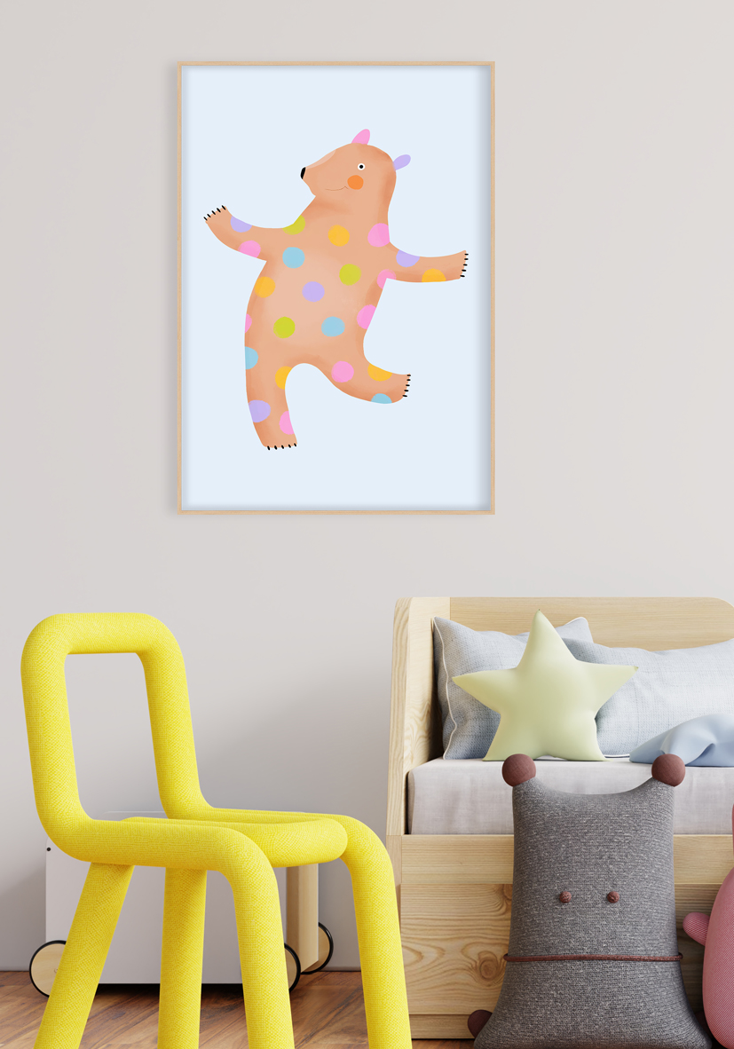 Ilustración alegre y caprichosa de un oso beige con lunares de colores sobre fondo azul suave. Perfecta para cuartos infantiles, decoración temática y proyectos creativos.