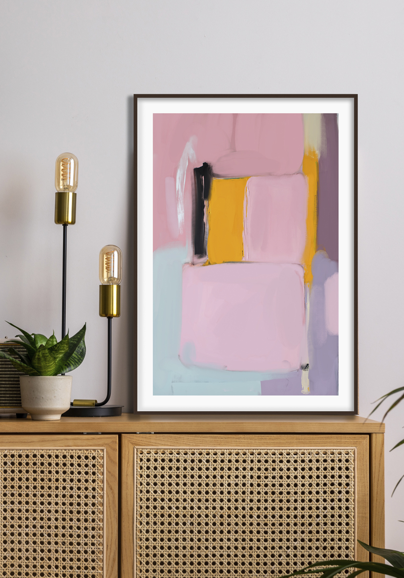 Pintura abstracta con tonos suaves de rosa, amarillo brillante y púrpura sutil. Diseño moderno con formas geométricas fluidas y difuminadas. Perfecta para decoración interior y expresión artística contemporánea.