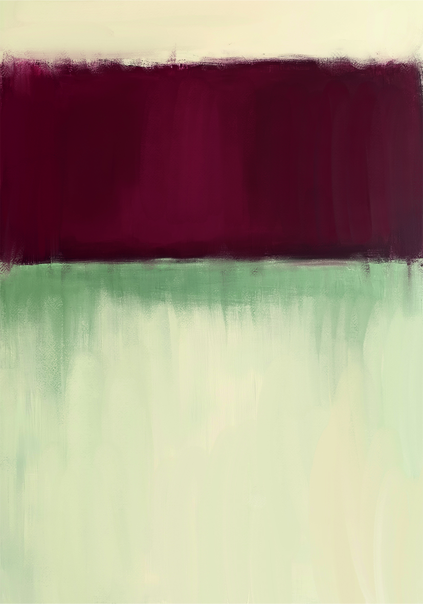 Obra abstracta con barra horizontal carmesí fuerte sobre fondo neutro y texturizado, evocando minimalismo y contraste equilibrado de colores.