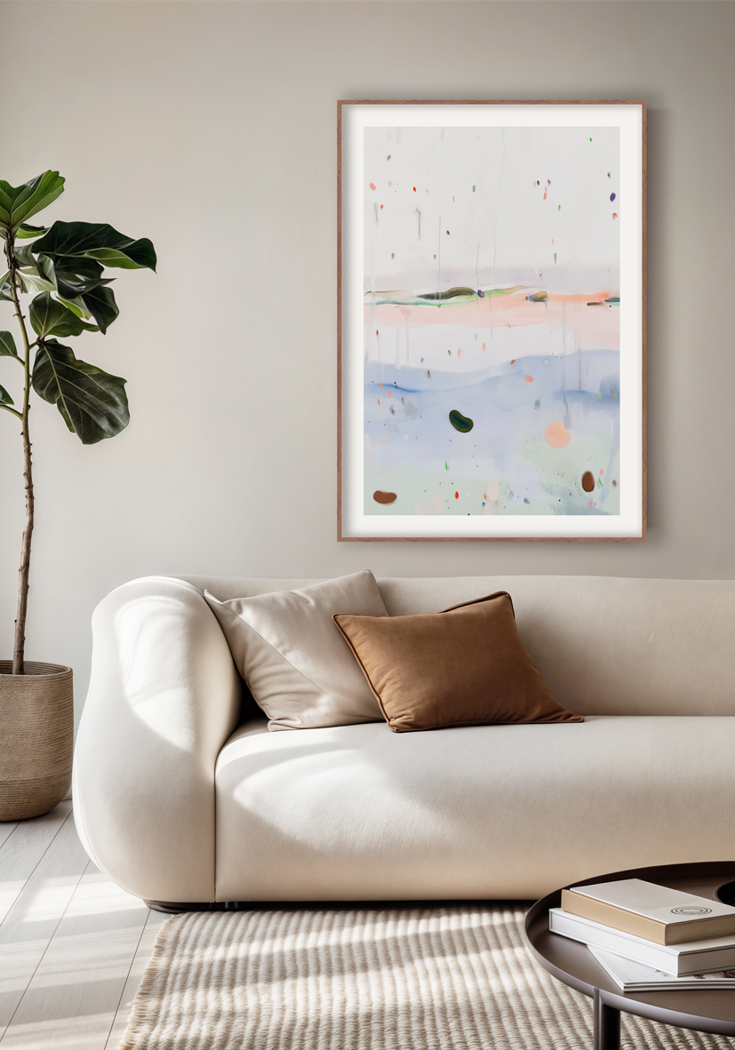 Obra abstracta minimalista con colores pastel fluidos en azul, rosa y blanco, acompañada de formas orgánicas flotantes que evocan calma y sofisticación moderna.
