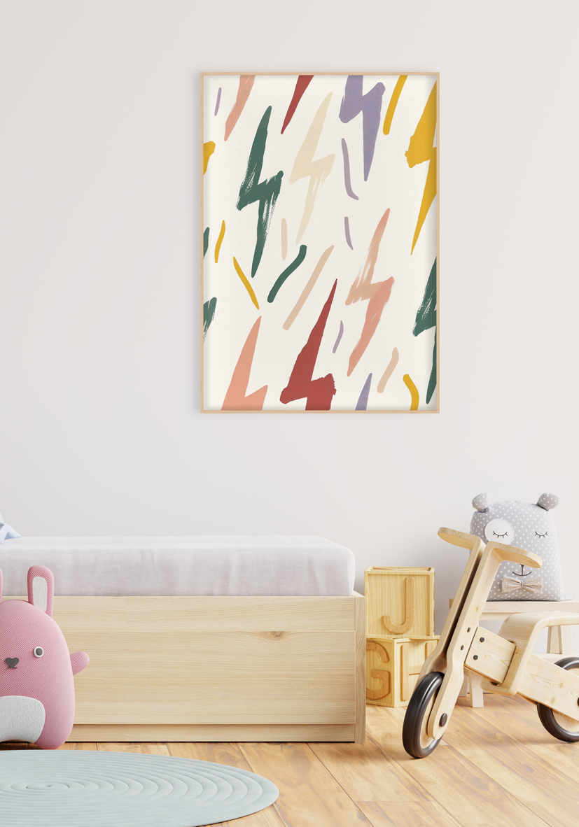 Diseño abstracto juguetón con pinceladas coloridas en tonos suaves como mostaza, verde y coral sobre fondo claro. Perfecto para interiorismo, papeles pintados o textiles que busquen un toque moderno y fresco.