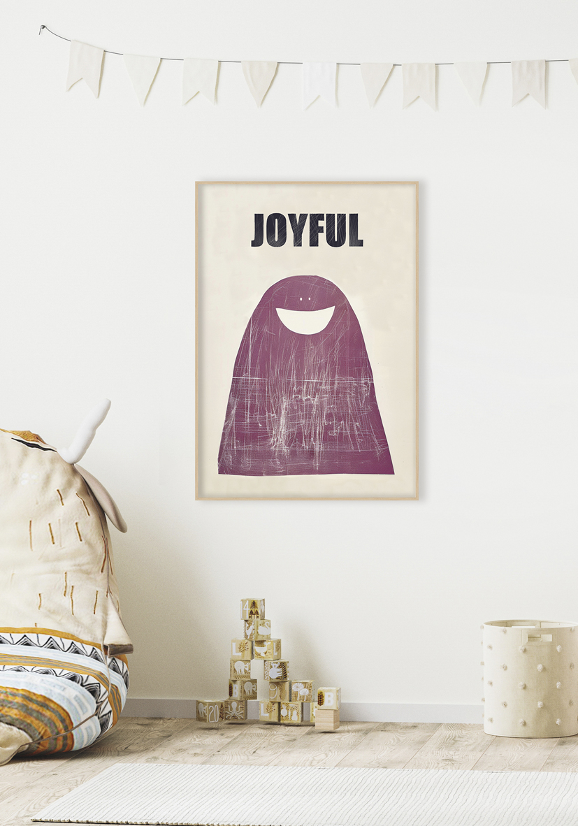 Arte gráfico abstracto colorido con texto expresivo “Joyful” en diseño texturizado y tonos magenta cálidos. Ideal para decoraciones modernas que busquen energía positiva.