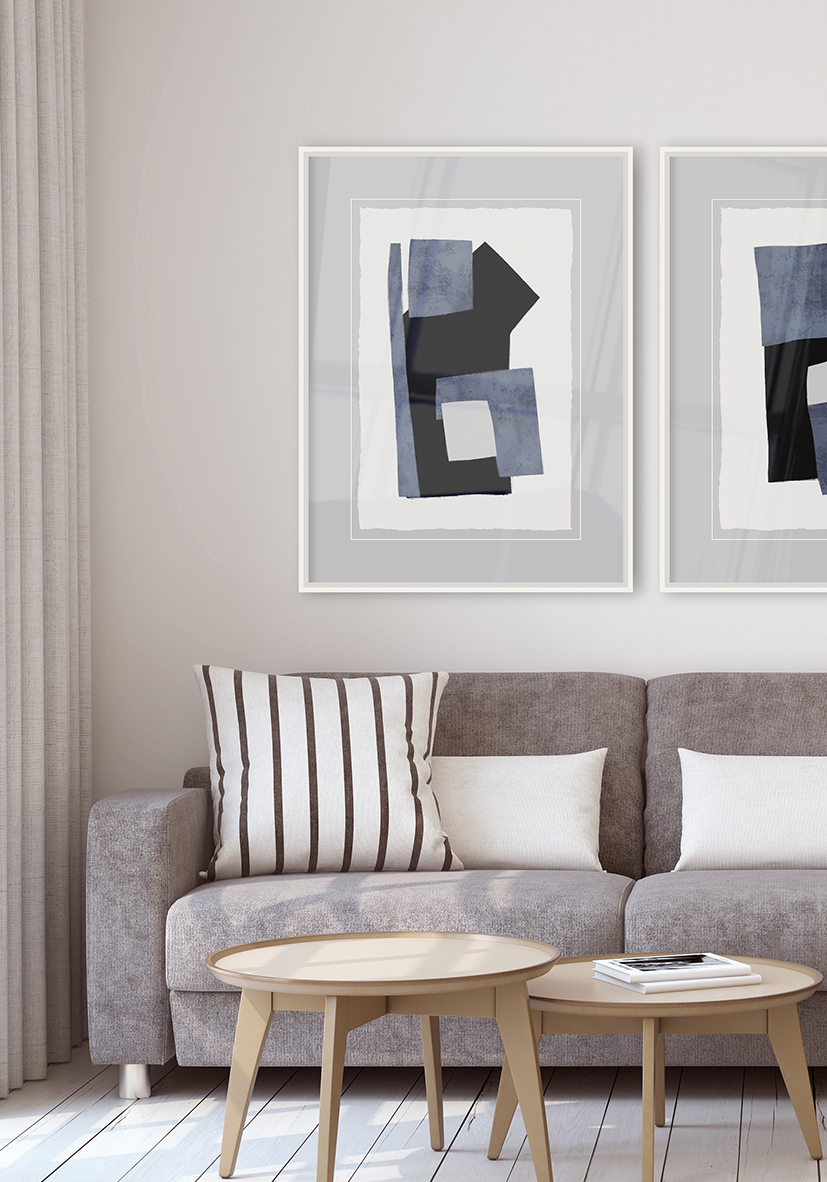 Arte abstracto con formas geométricas superpuestas en tonos texturizados de azul, gris y negro. Aporta modernidad y sofisticación a interiores minimalistas y contemporáneos.